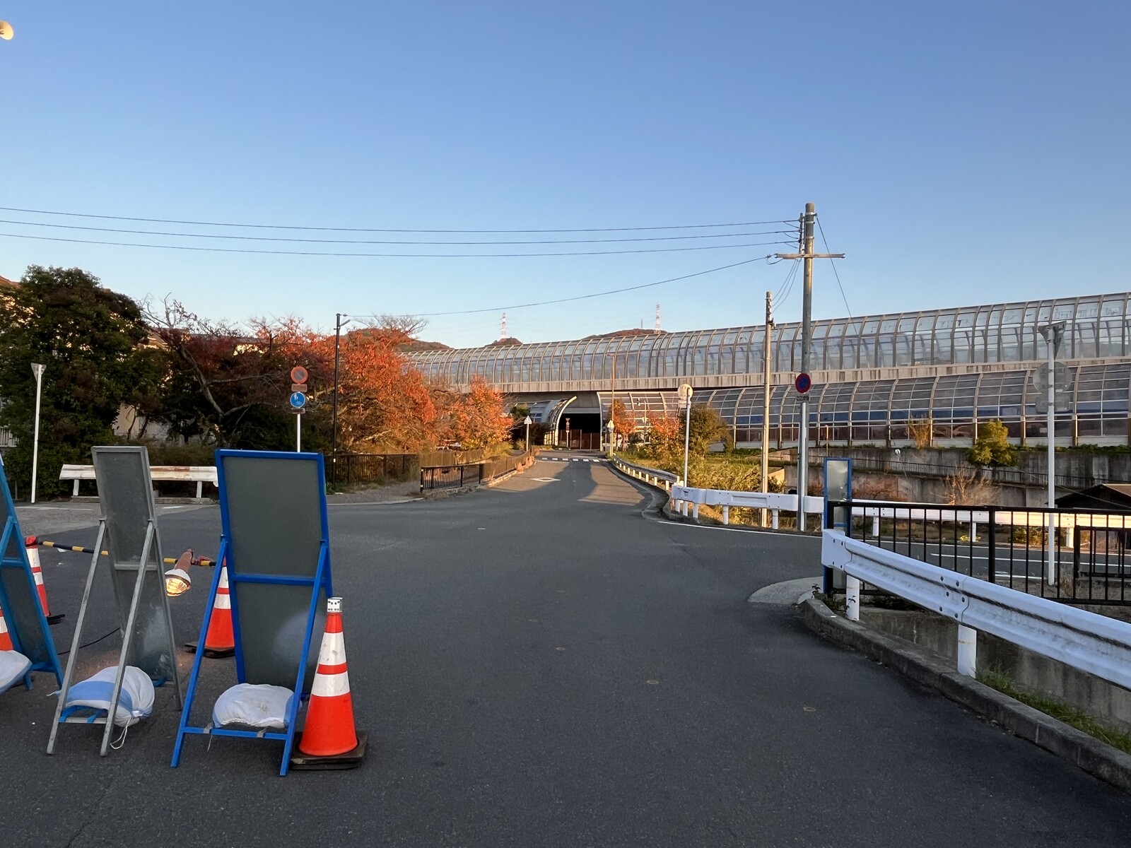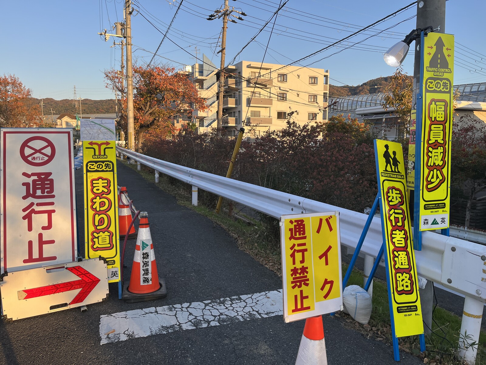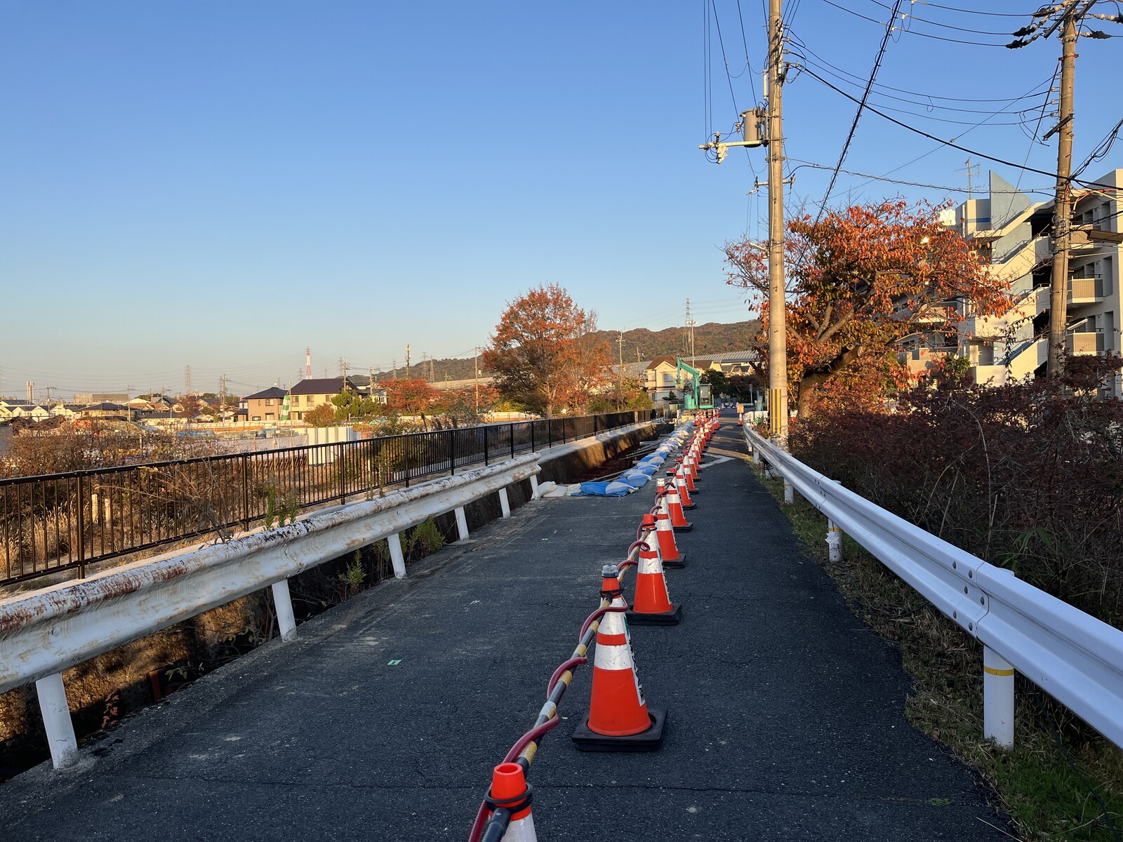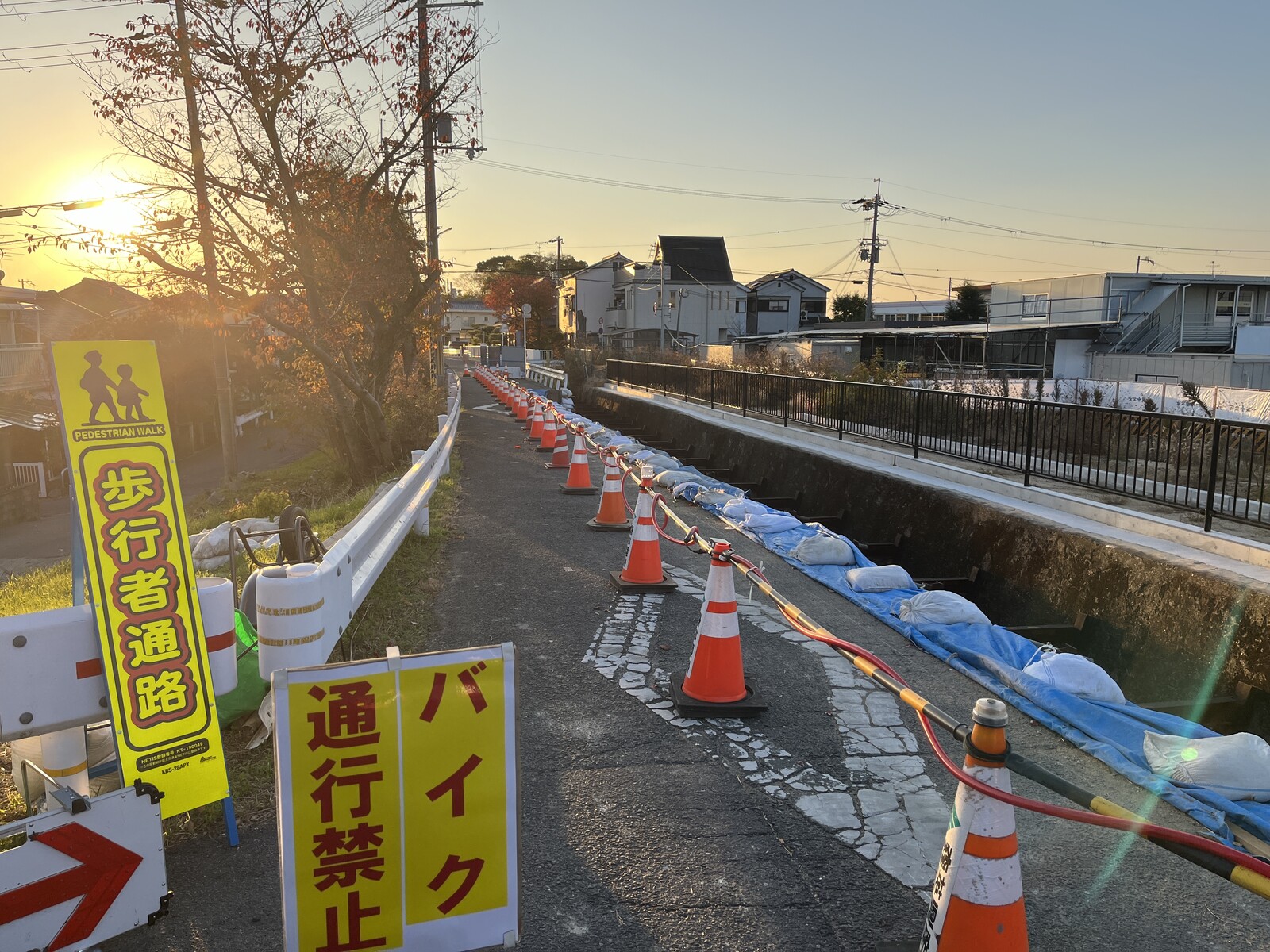 三角コーンがきれいに並べられていて目立つように歩行者通路になっていますが、その向こうは川なので通行の際はお気をつけくださいませ。