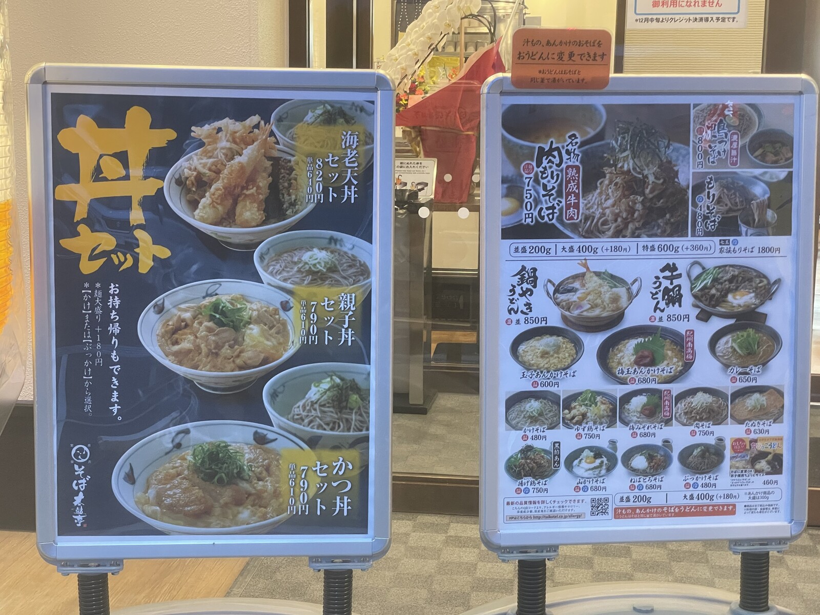 お店の入り口には、丼セットと看板メニューの肉盛りそばの案内が立っていました。