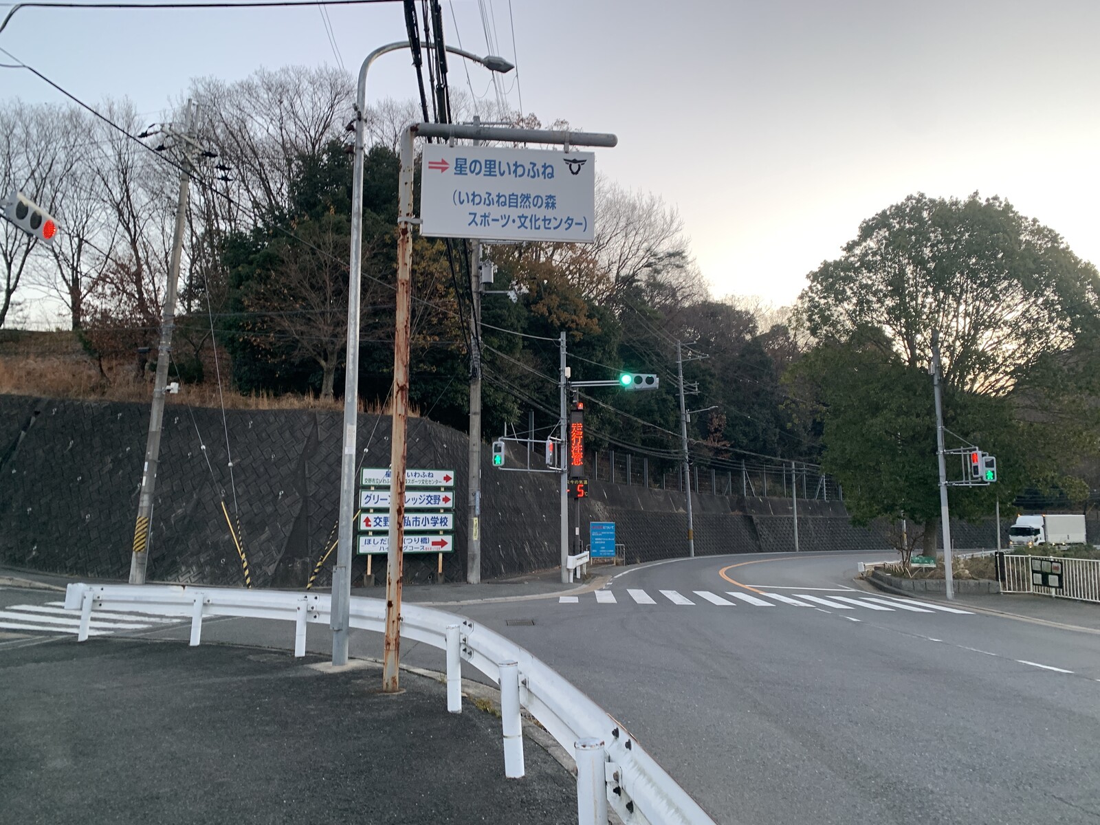 向かって右手は星の里いわふね。左手には交野市立私市小学校があります。