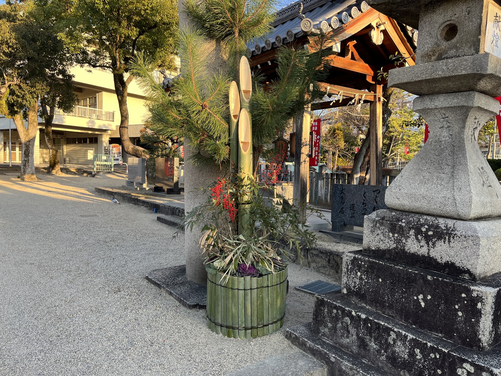 鳥居のところには大きな門松の飾りが2つ設置されていて、周囲の初詣の旗とセットでかなりお正月ムードがあります。