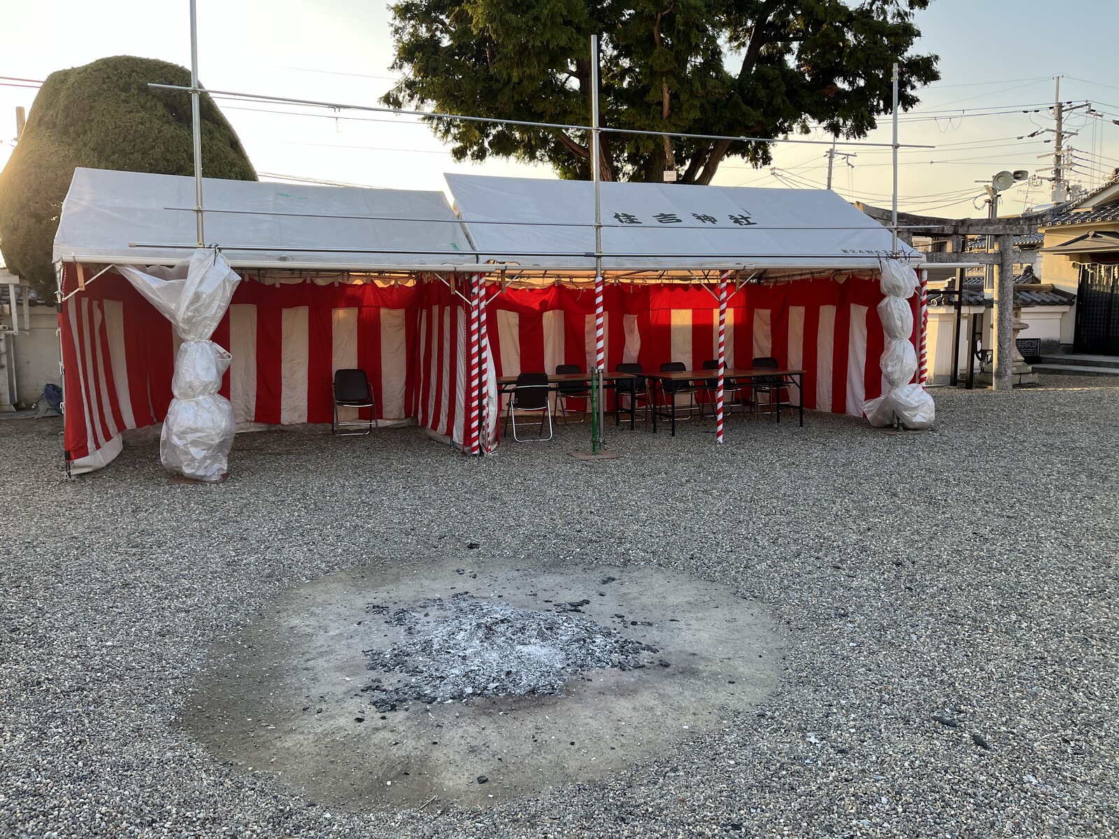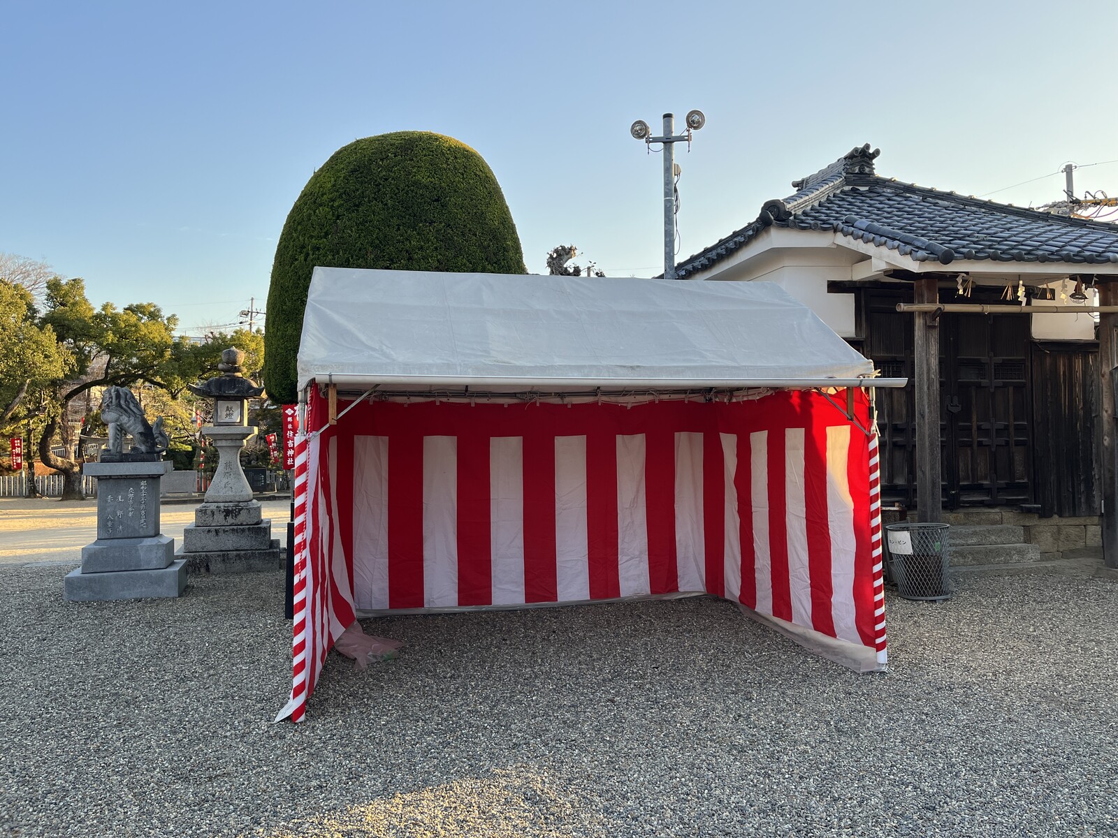 テントや門松やいろいろ。住吉神社で初詣の準備進んでる。