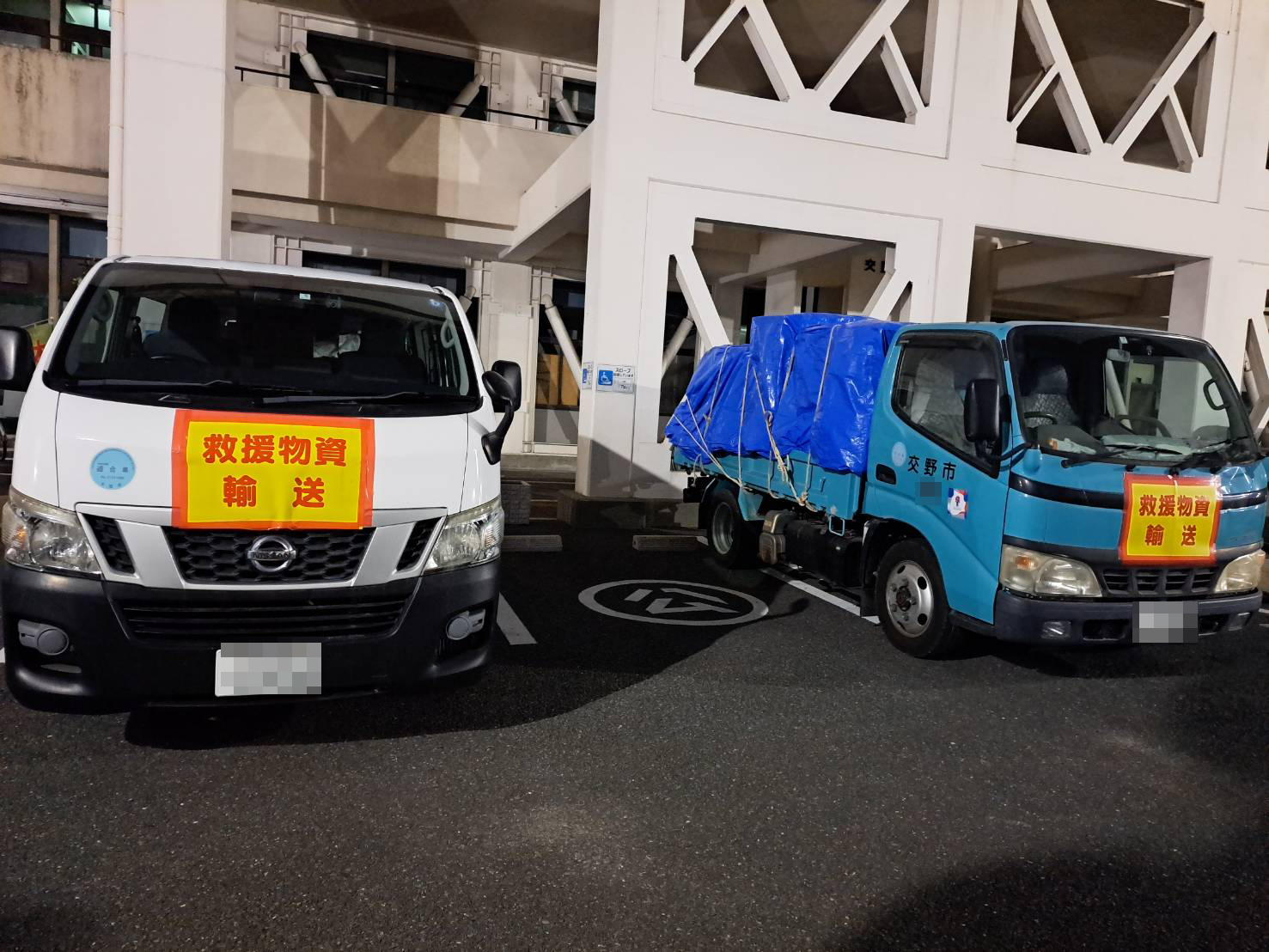 石川県の市町を支援する石川県小松市より、石川県金沢市にある石川県産業展示館への支援物資の搬送要請を受け交野市単独で先遣隊として支援物資の搬送実施したとのこと。