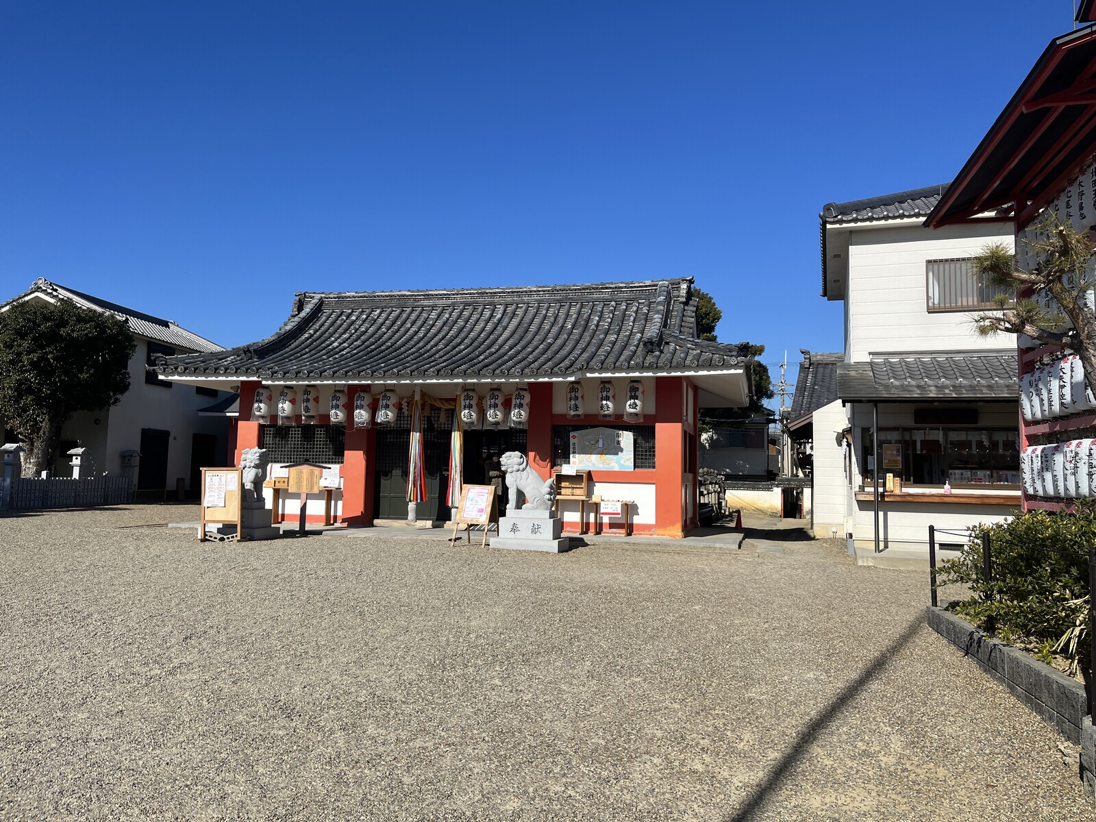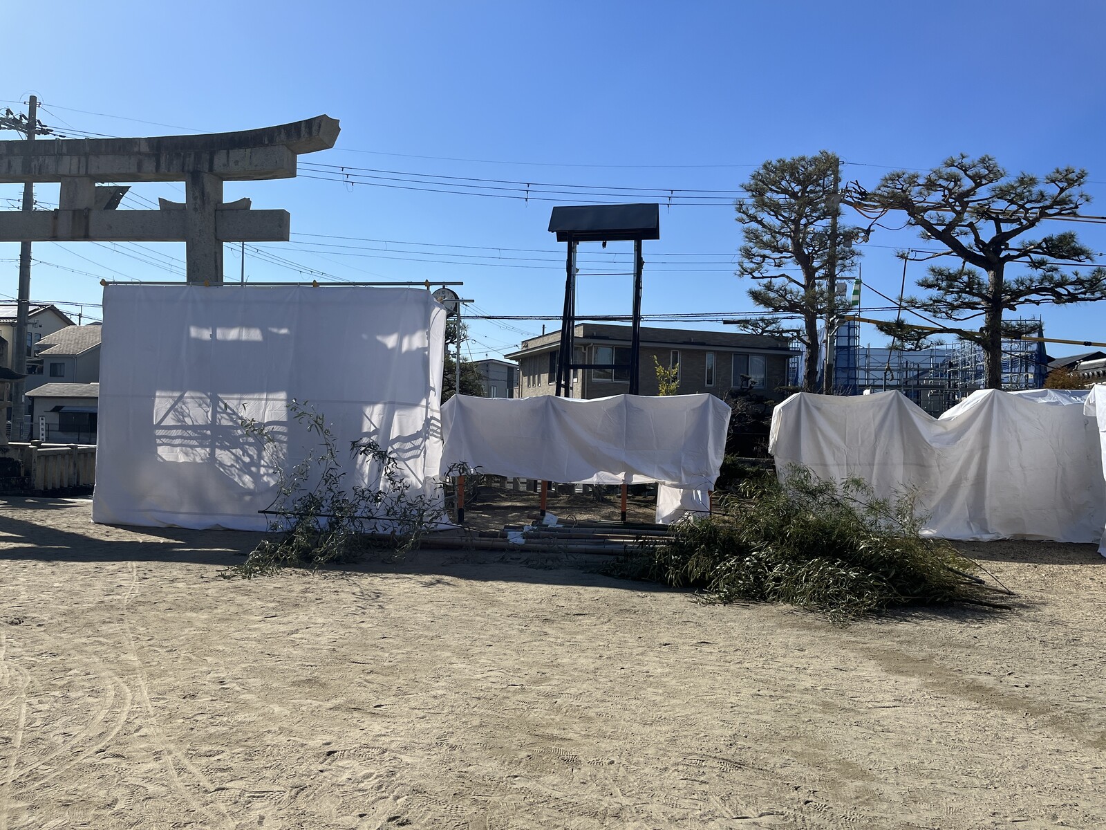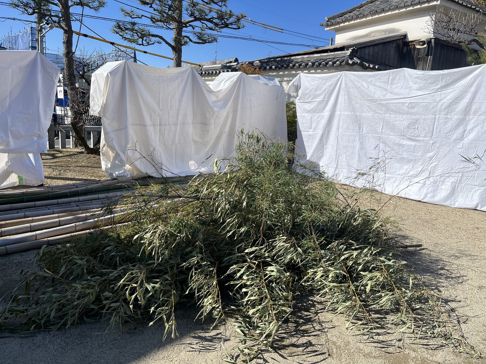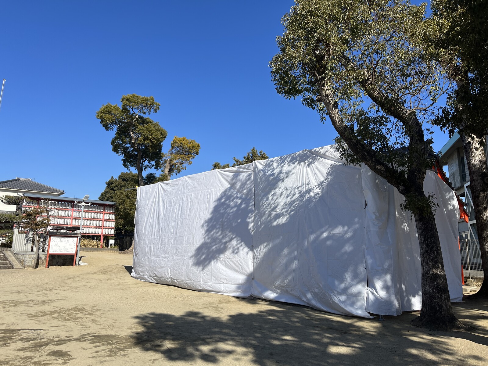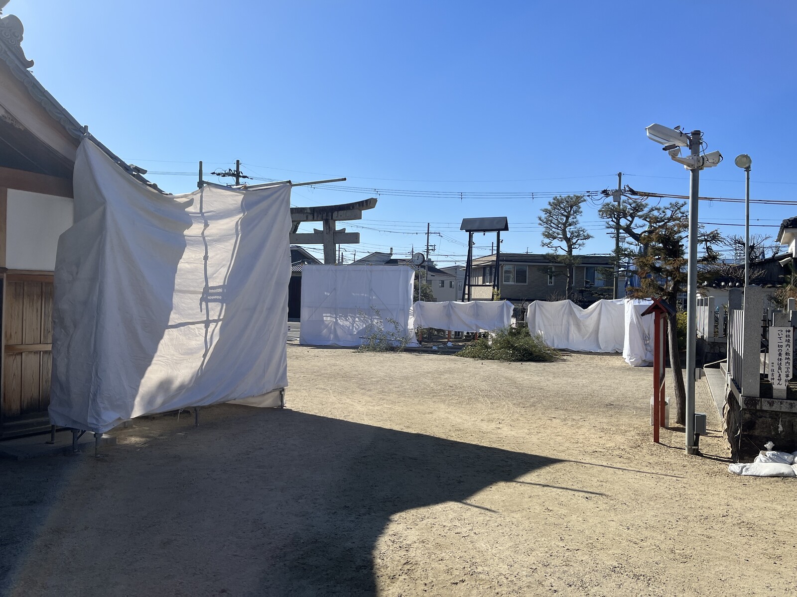 境内にはとんど焼きの準備で白い幕があちらこちらに張られていて、これらはとんどの火から建物や樹木などを守る養生のために設置されているようです。