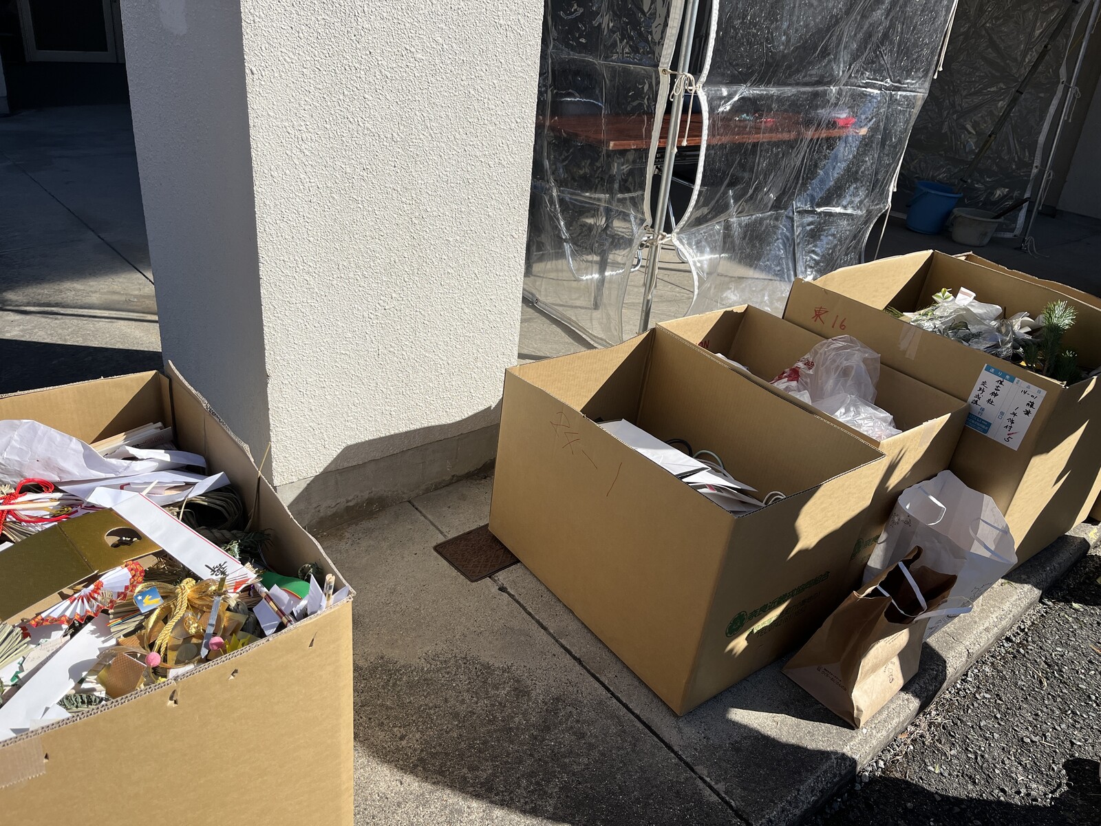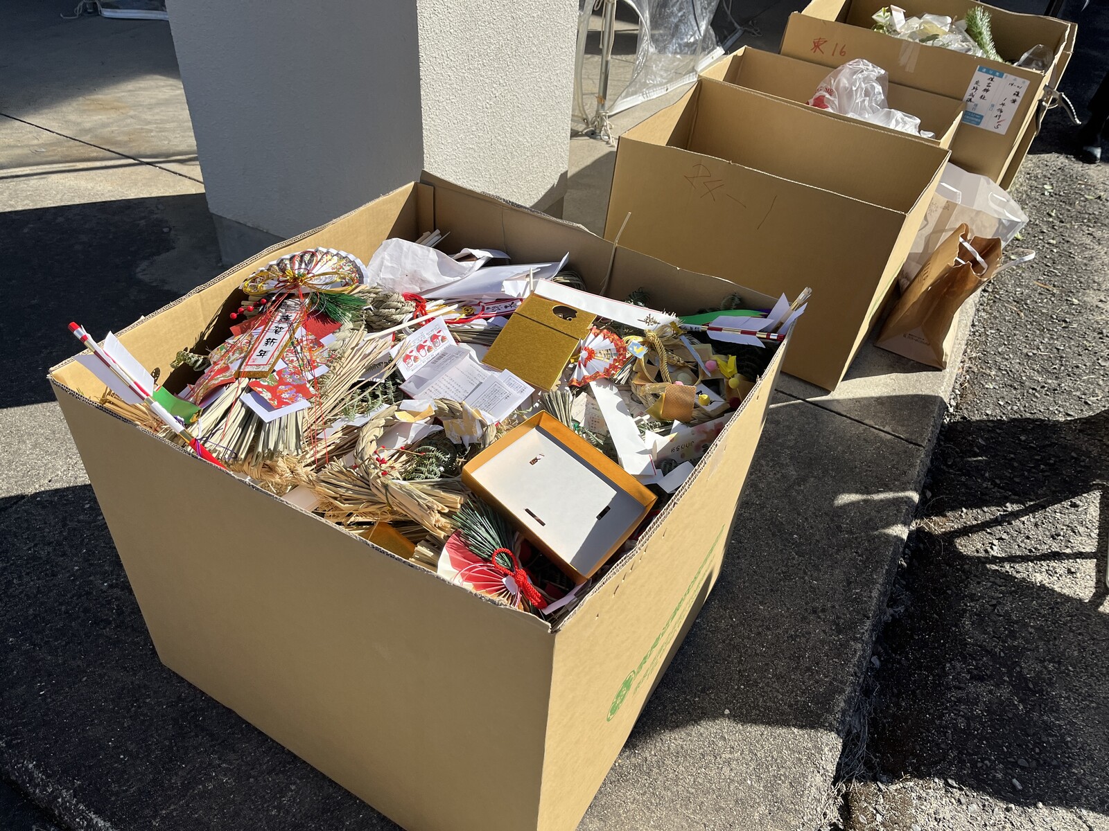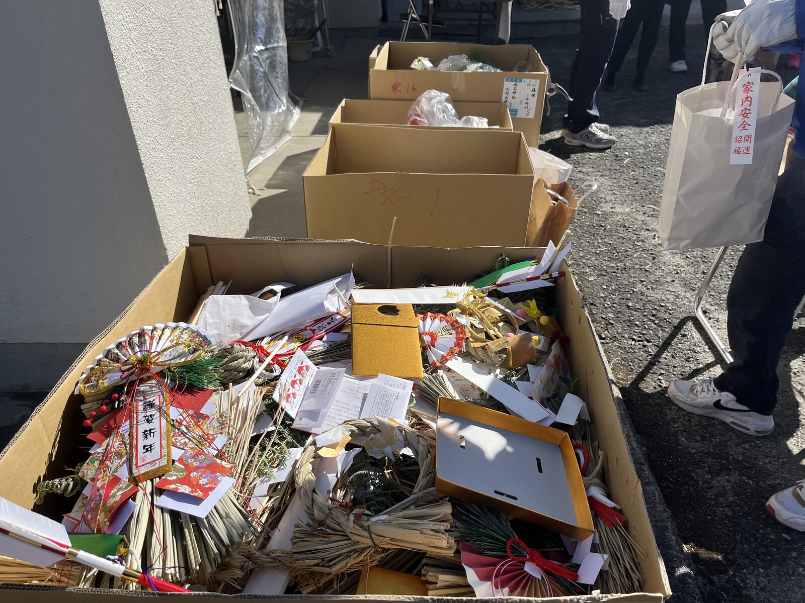 大きな段ボールが用意されていて、持参したお守りなどは、受け取られた係の方がそれぞれ仕分けをしてそれぞれの段ボールに入れていかれます。