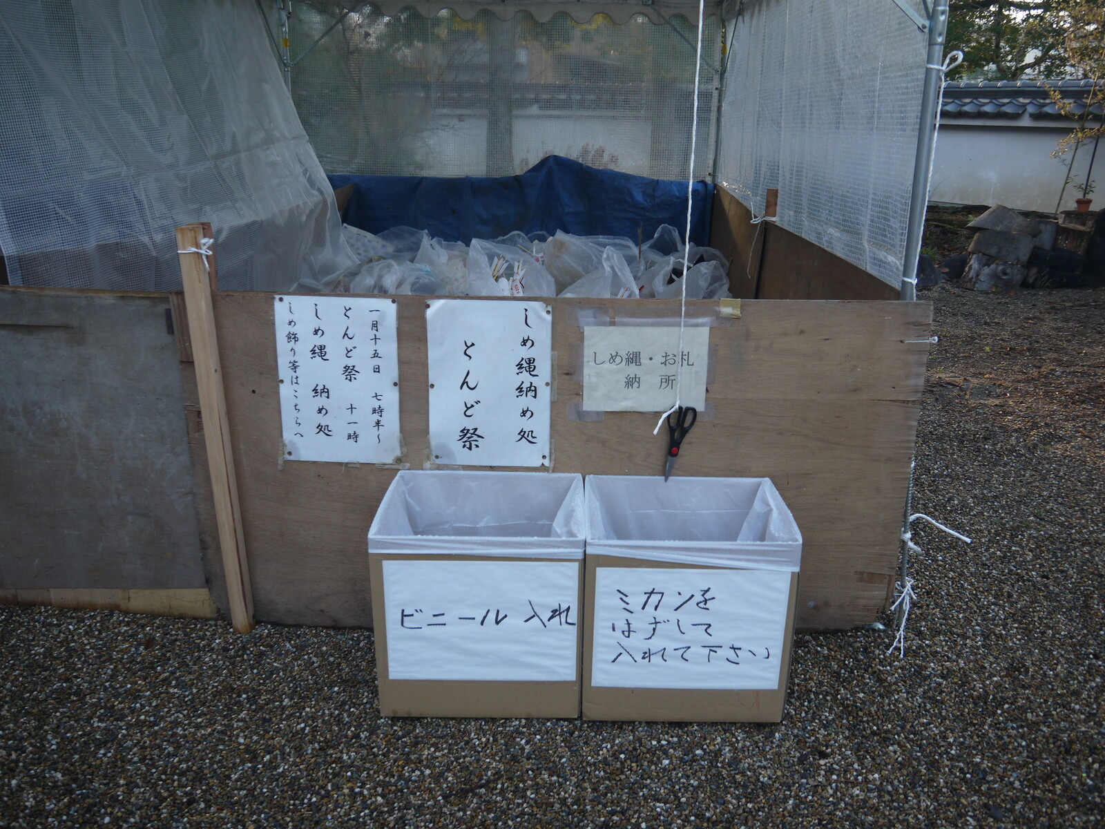 1月15日には、どんと焼きが開催ということで、機物神社に行った時には、収集ボックスが用意されていて、しめ飾りとか、お札とかを集めてくださっていました。