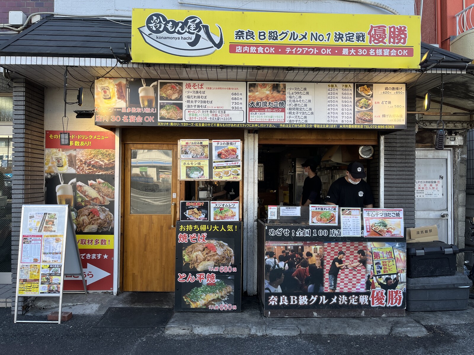粉もん屋八さんは、店舗看板にあるようにかつて奈良県B級グルメNo.1決定戦で優勝されたこともあるお店でお店の前を通るとほぼほぼいつもたこ焼きを作られています。