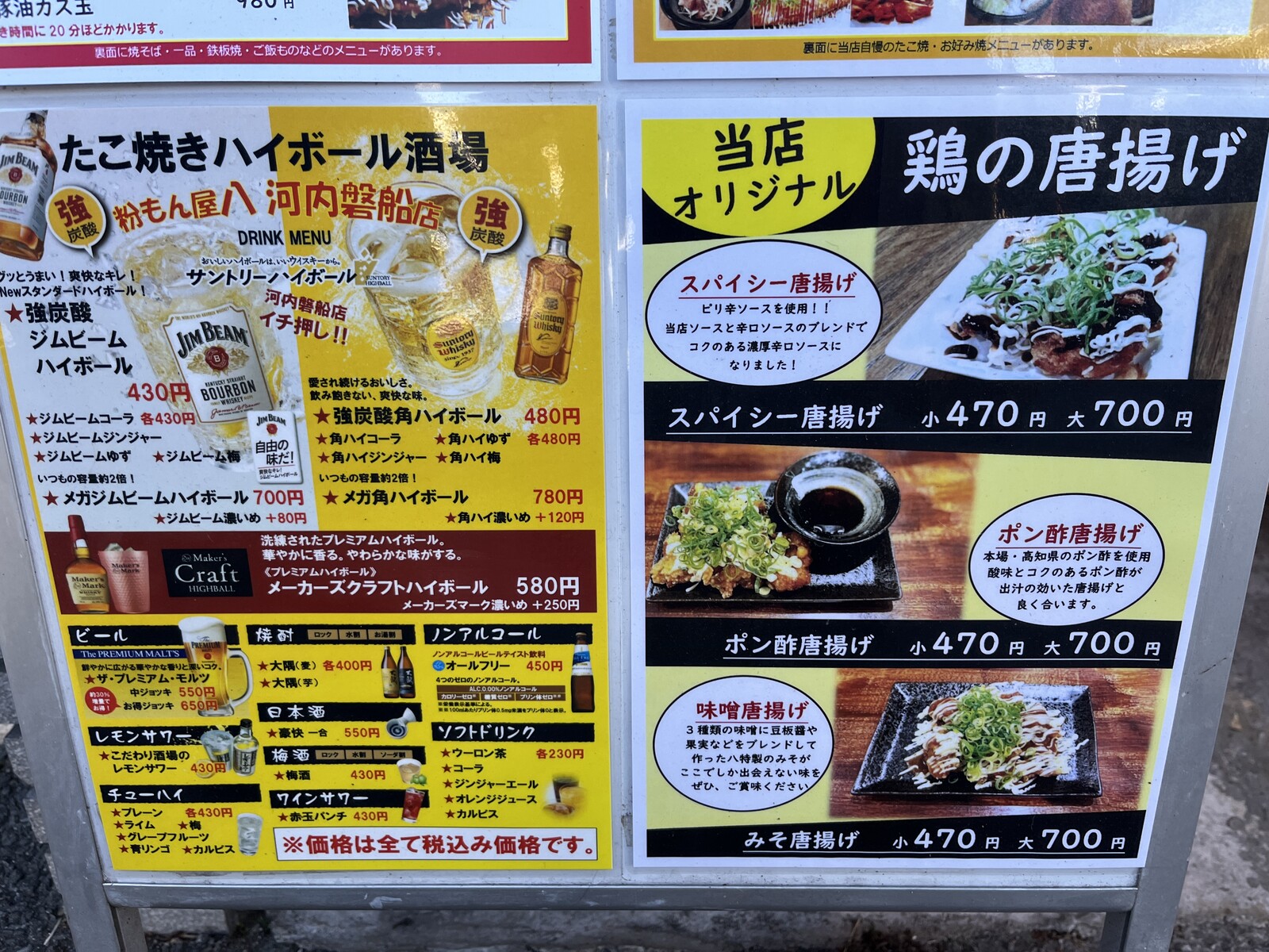 前述しましたが、粉もん屋八さんで個人的にいいなぁと思うところの1つはイートインスペースで、お酒や唐揚げや枝豆など店内メニューのみのもあって夜に行くと居酒屋さんのような感じ。