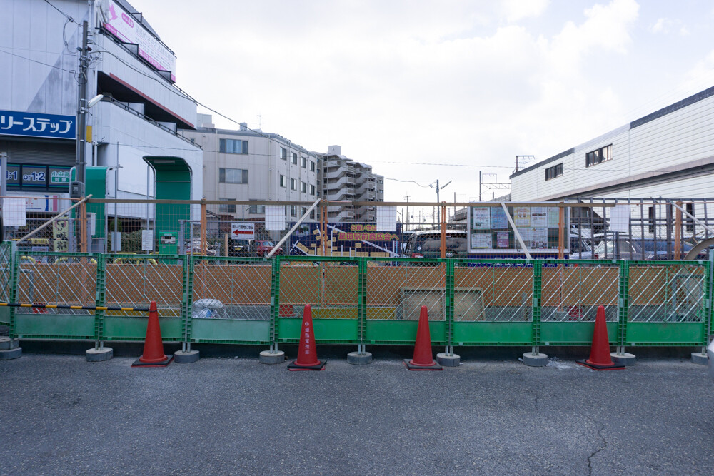写真奥が星田駅。歩道の一部にオレンジ色の仮囲いが設置された状態になっています。