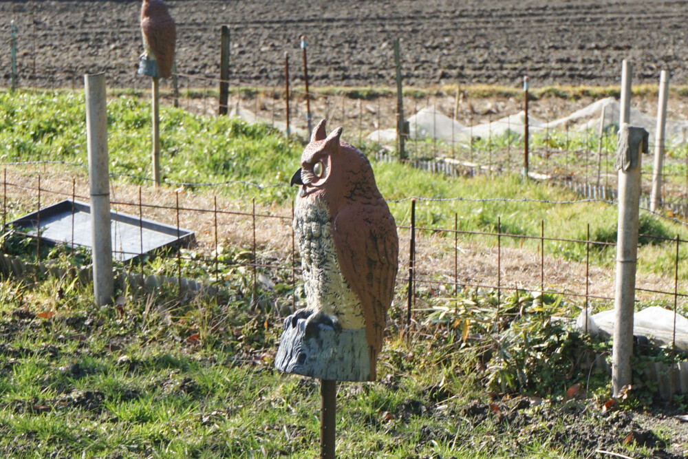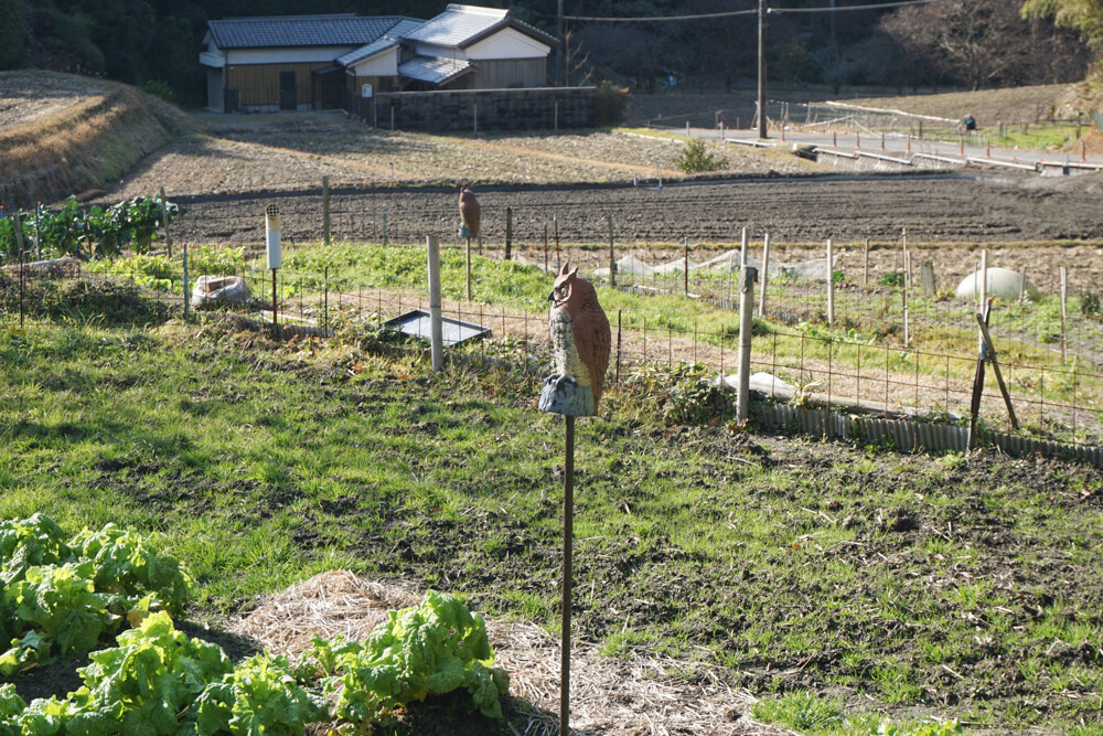 その集落の畑で猛禽類の姿をした案山子を見つけました。