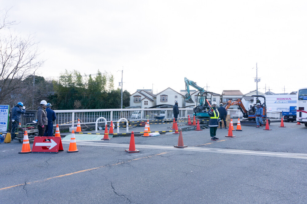 工事中は警備員さんの誘導による片側交互通行が実施されていましたが…、