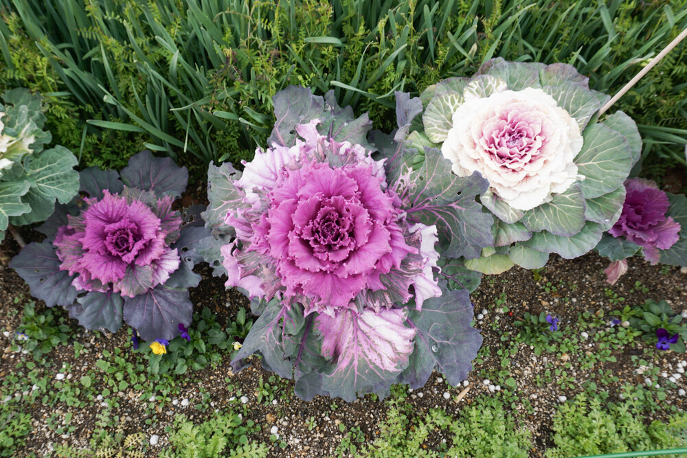 バスロータリーの真ん中の植え込みには、ハボタンが咲いていました。ハボタンといえば、門松の飾りつけにも使われる冬の植物です。