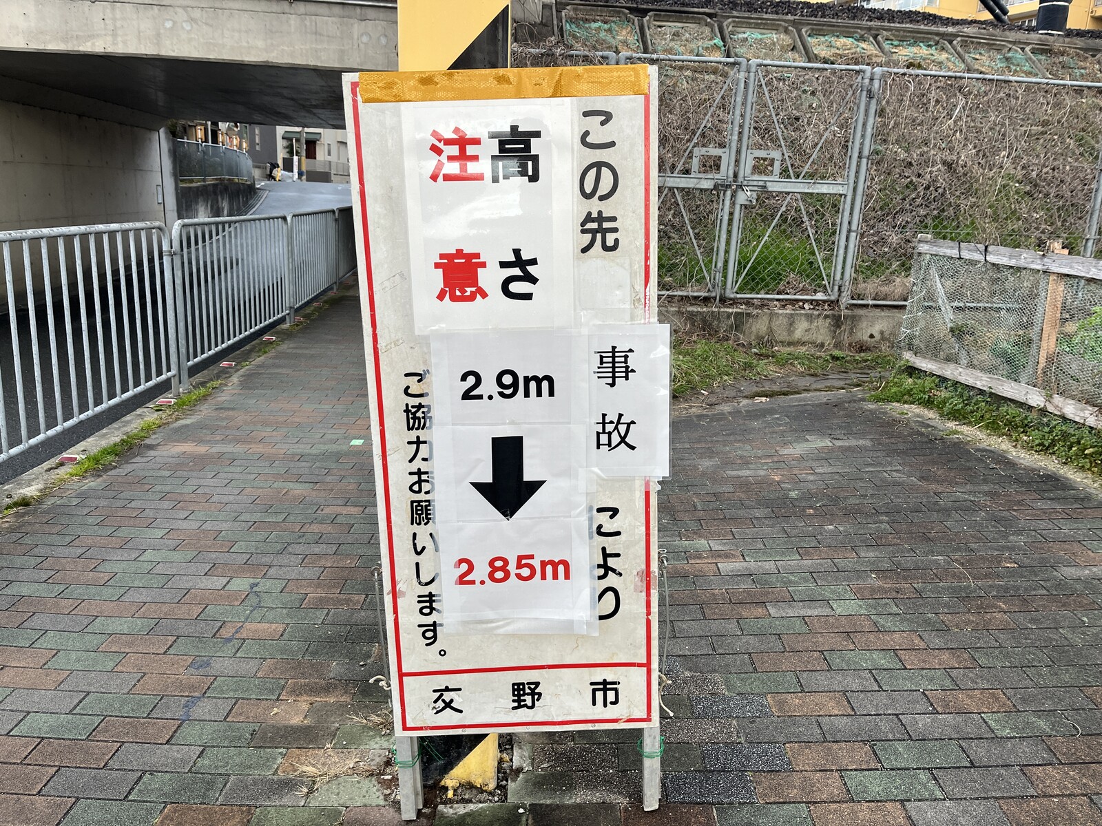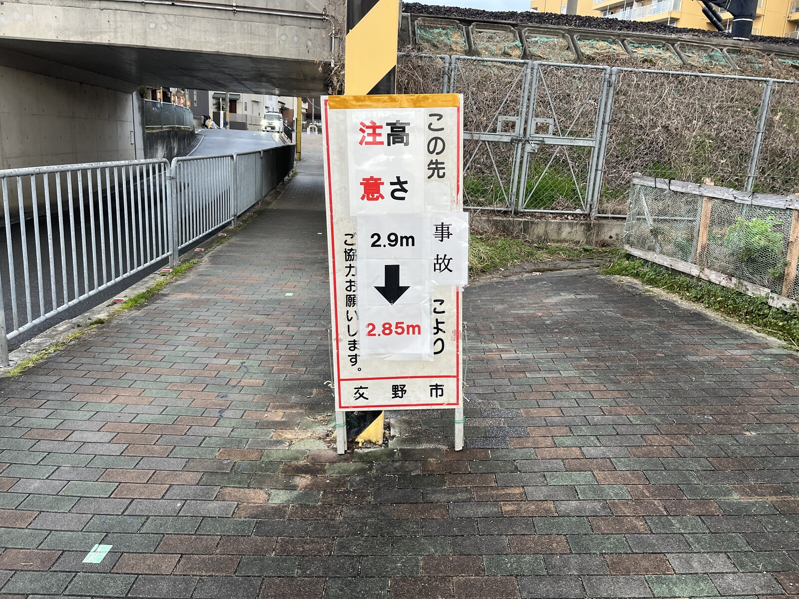 看板には「この先高さ注意2.9m→2.85m 事故」と書かれていました。