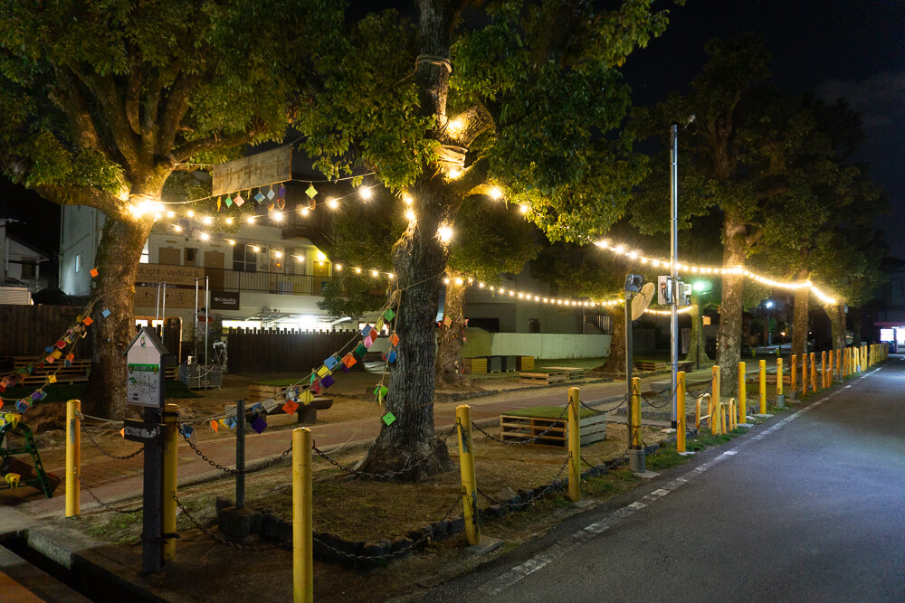 公園のクスノキ同士を結ぶ電飾が点灯し、きらびやかな光景になっています。明るく照らされた遊歩道を抜けた先に待ち構えているのは、