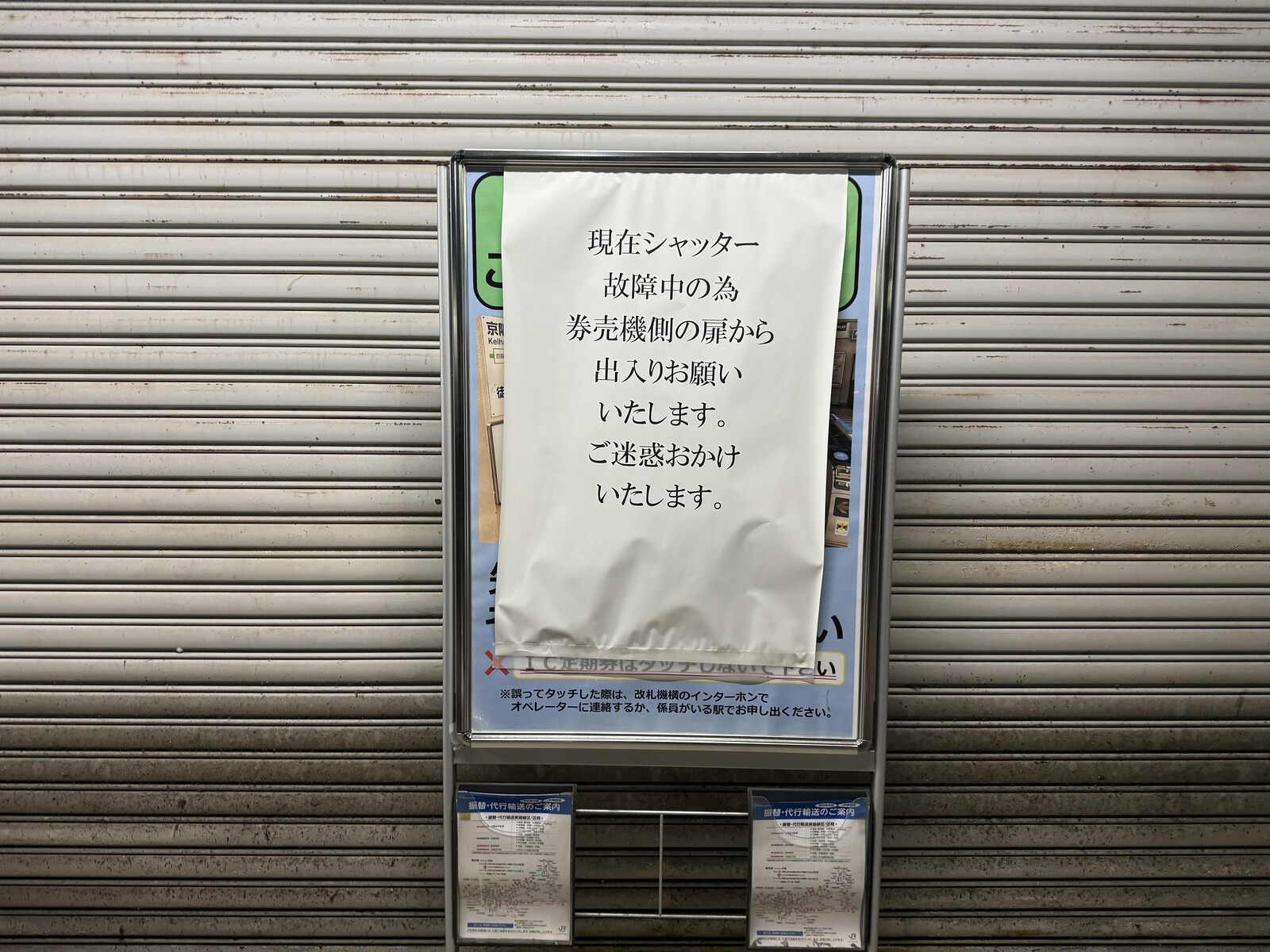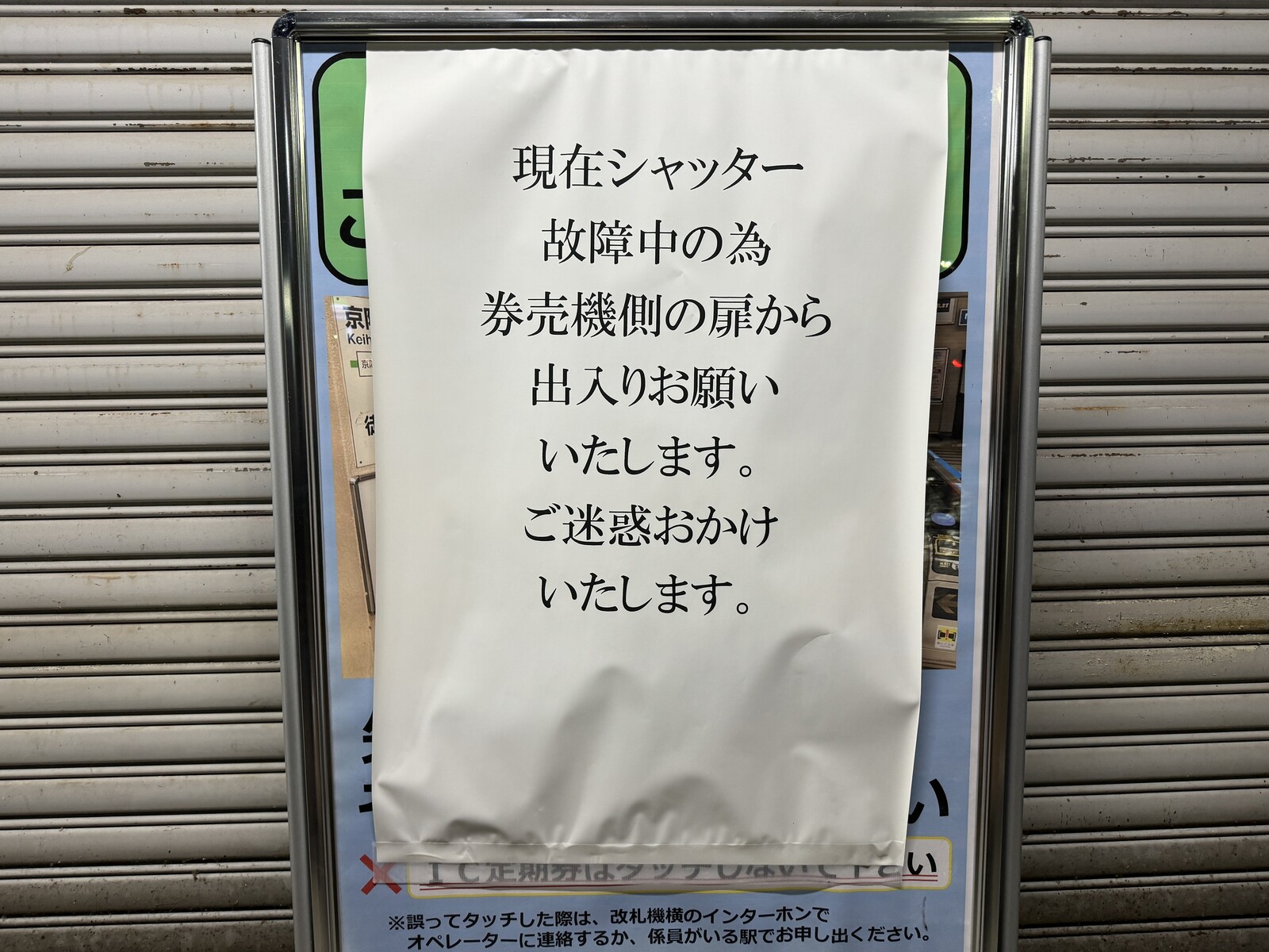 朝一の通勤でここを利用された方いわく「その時はシャッター開いてて普通に改札前の入り口から入りましたよー」だったので、いつのタイミングでシャッターが故障して入り口1か所になっていたのかは不明ですが、普段あまり見かけない光景だったのかなと思います。