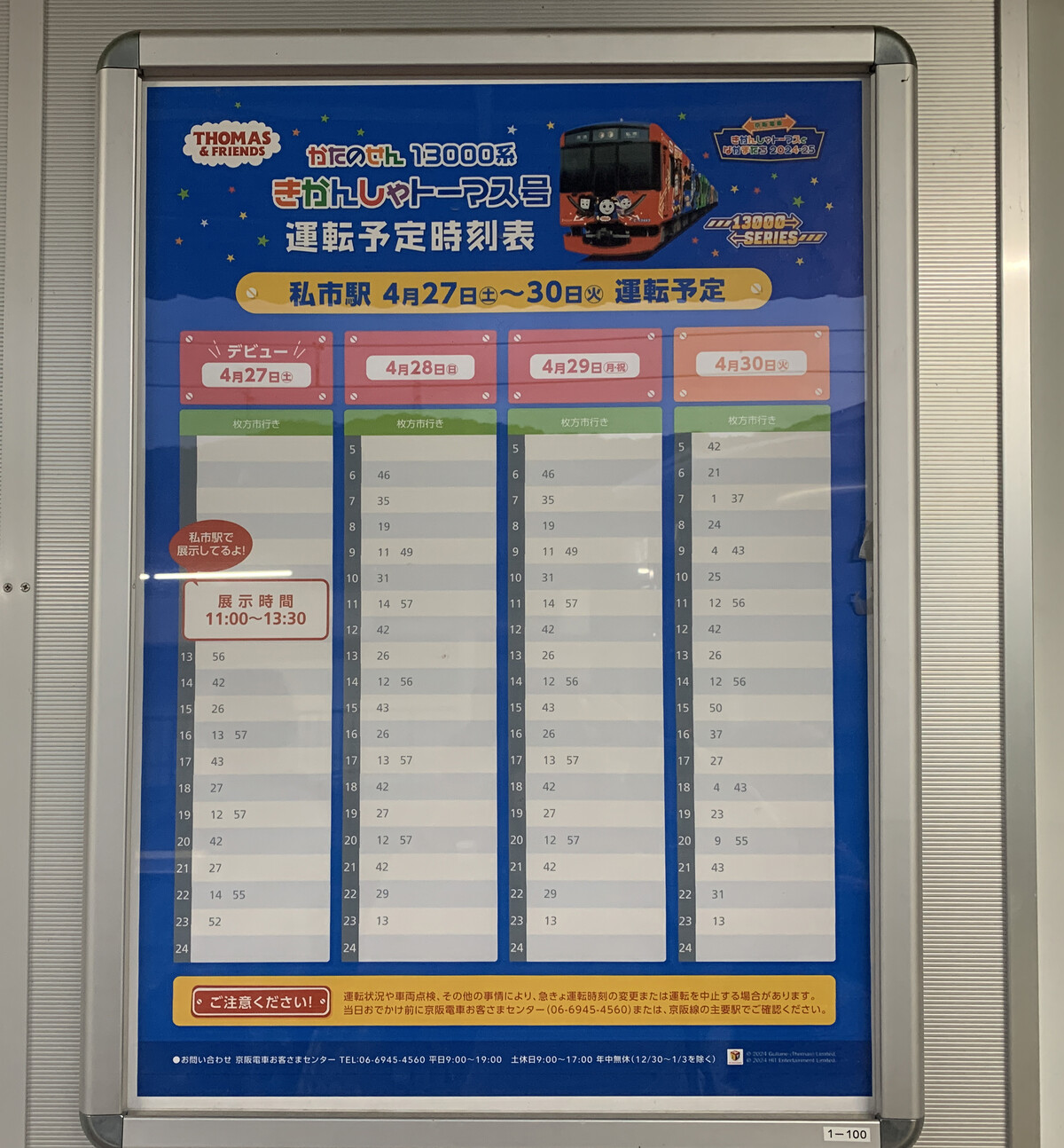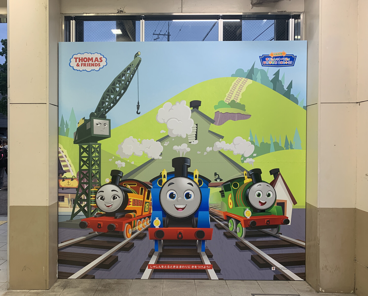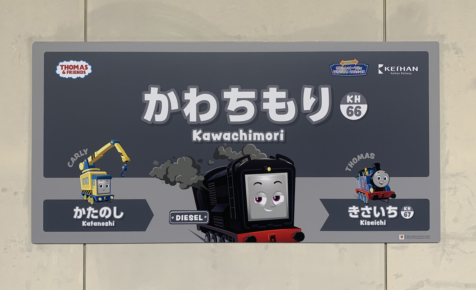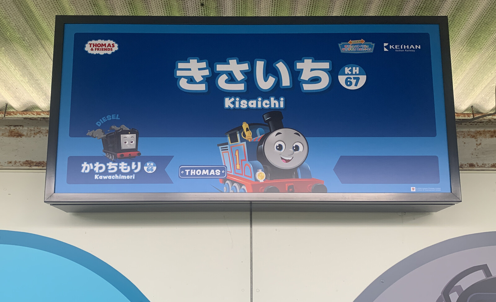 いよいよ明日、27日(土)「13000系京阪電車きかんしゃトーマス号」運行開始!駅看板や駅装飾がトーマス仕様になっている!