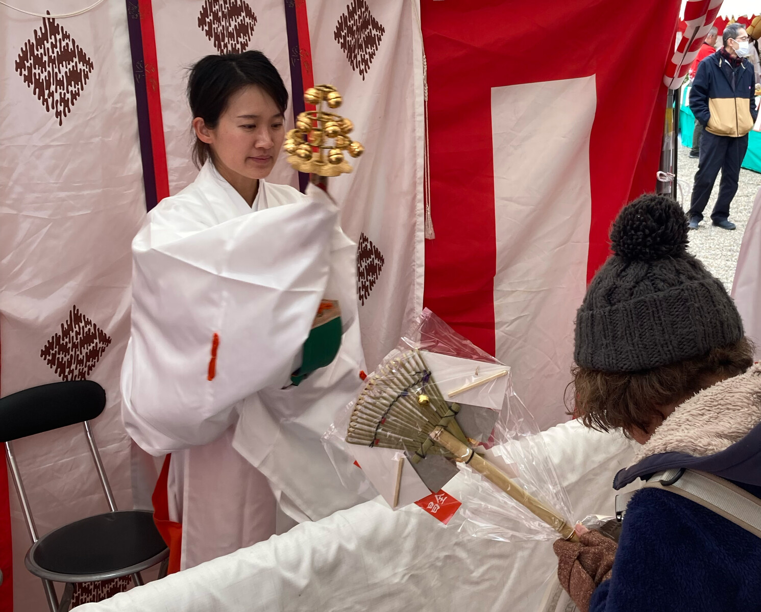 笑顔がすてきなおふたりの福娘さんから、「たくさんの福」と「おつり」と「福引券」と「熊手」をもらいました。