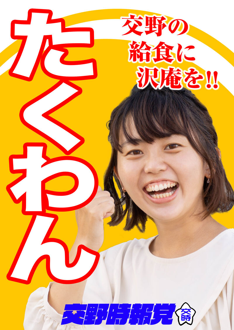 この度の選挙で交野タイムズ公認で出馬することになりました、交野時報党(かたのタイムズとう)代表のタクワンです!
