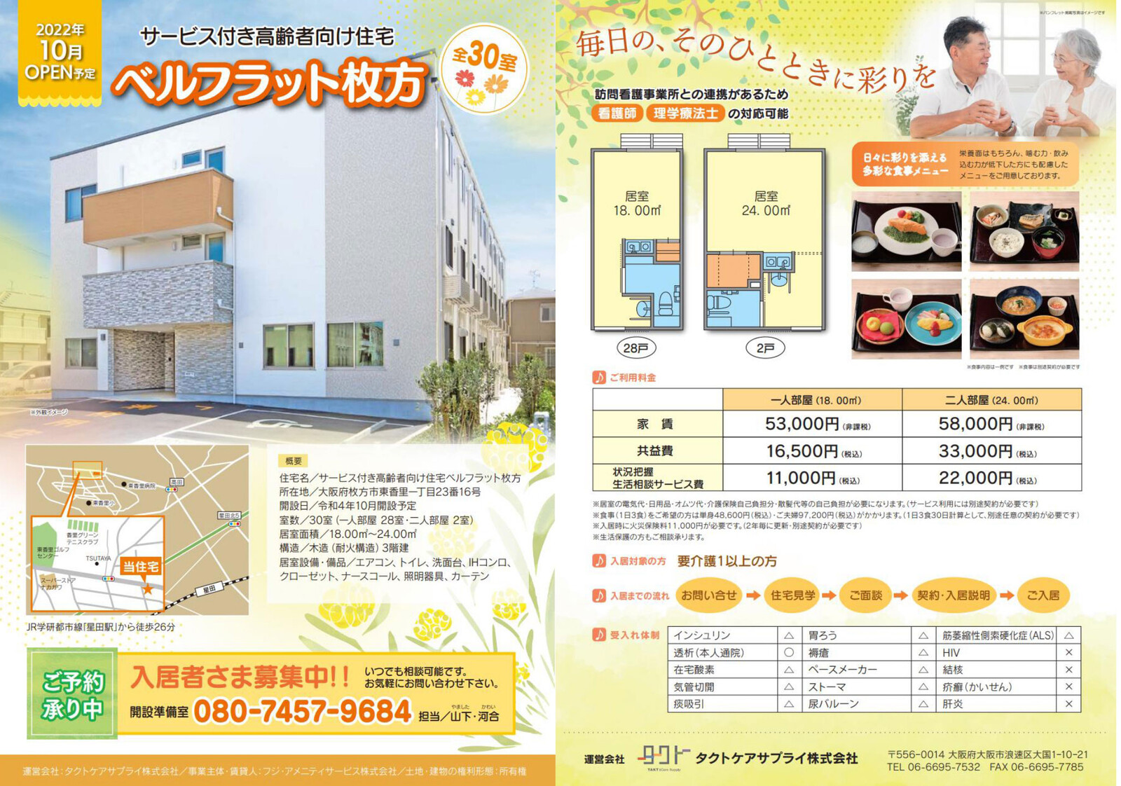 平野さん:ベルフラット枚方は「サービス付き高齢者向け住宅」とある通り、高齢の方を対象とした生活・介護サポート付きの住宅施設となります。