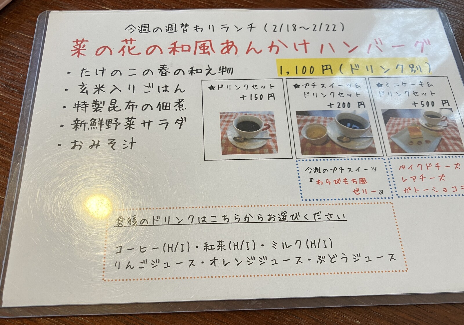 カフェチアーズの「菜の花の和風あんかけハンバーグ」で春の味覚を一足先に堪能