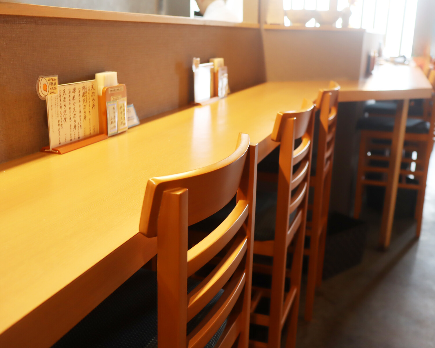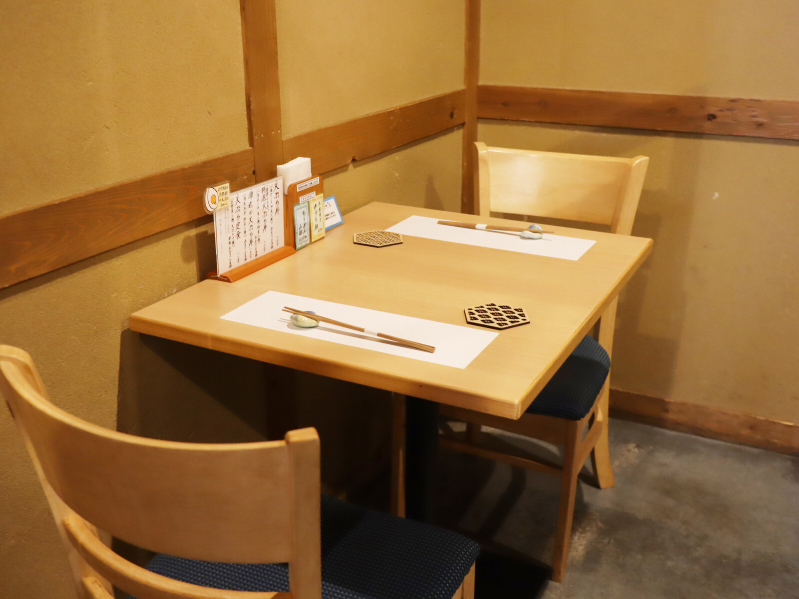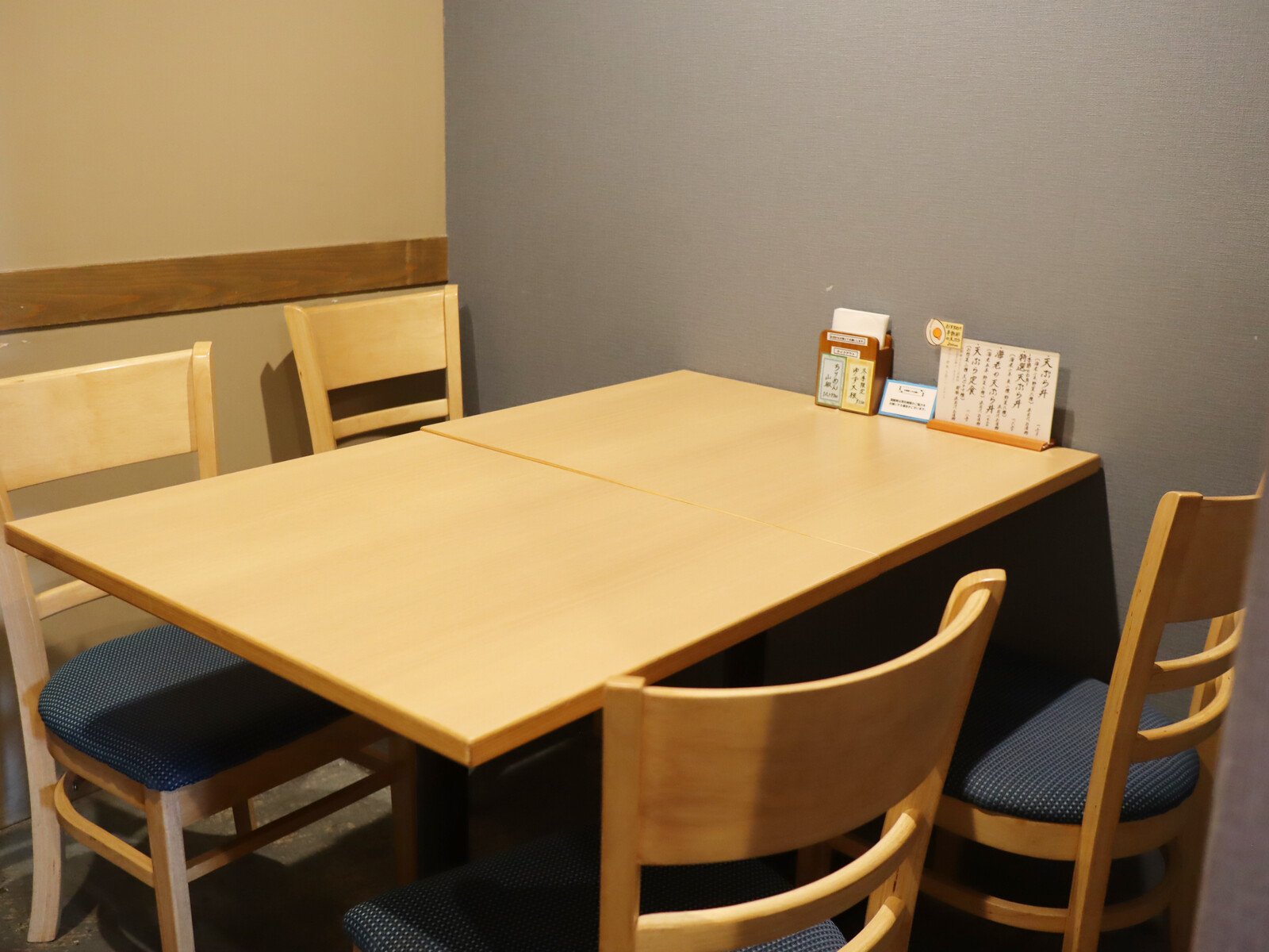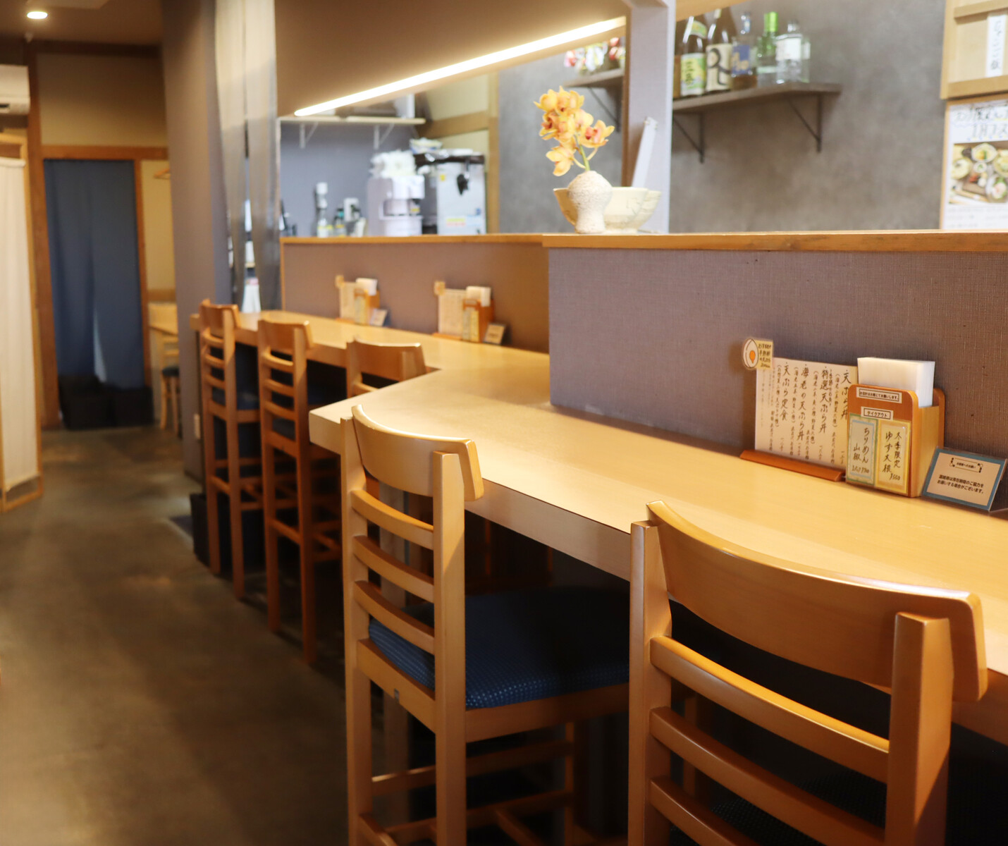 紺色の「てん」カラーが店内のキーカラーにもなっており落ち着いた雰囲気。