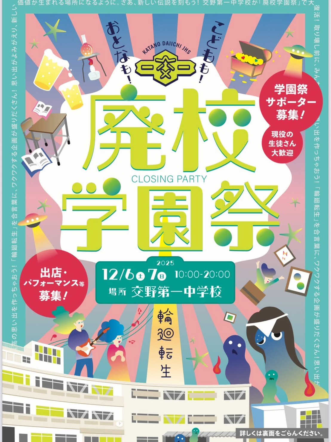 来年取り壊される旧交野1中で「廃校学園祭」っていうのが開催される!12月6日(土)、7日(日)