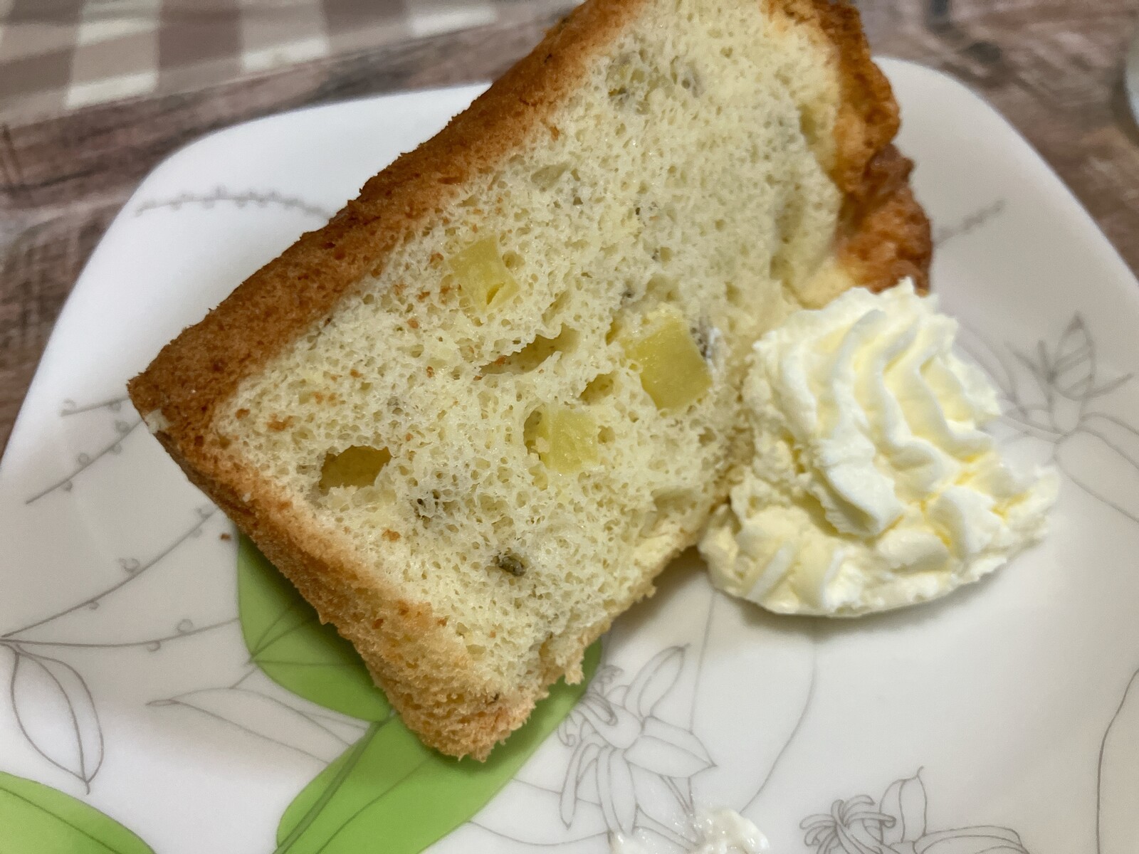 ふわふわのシフォンケーキの中で、甘くてねっとりとした食感が良いアクセントになっています。