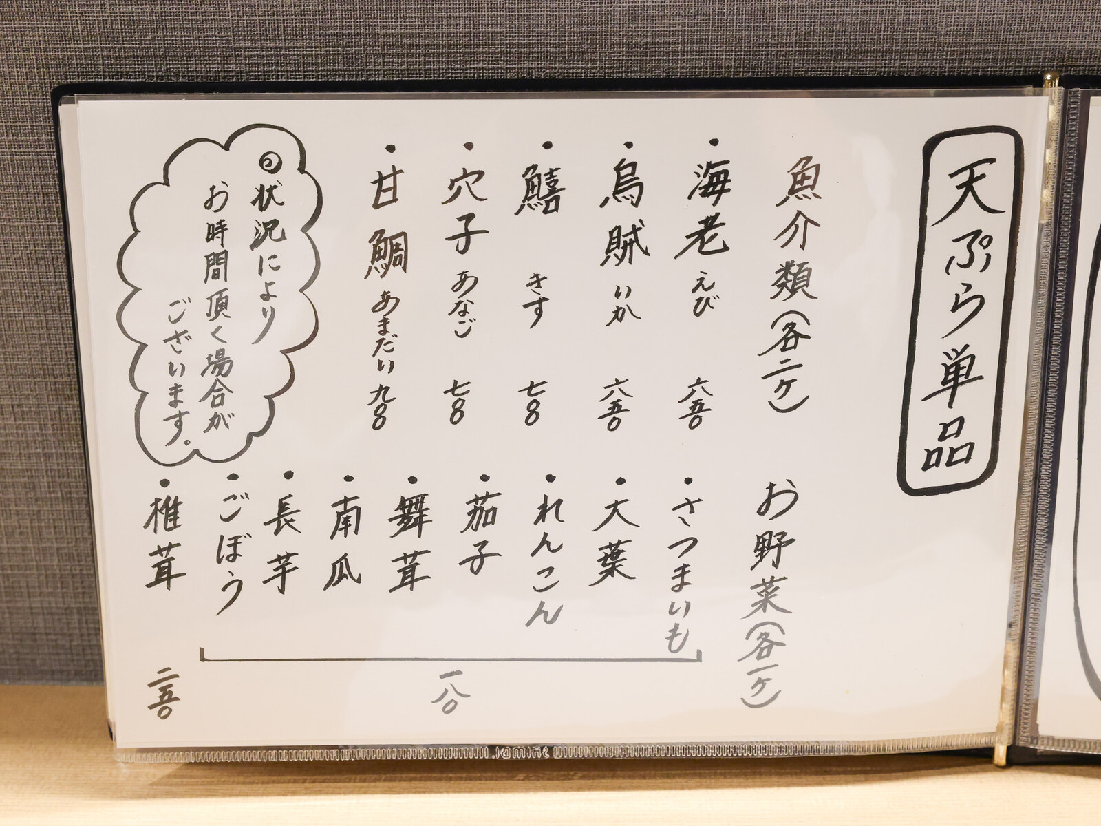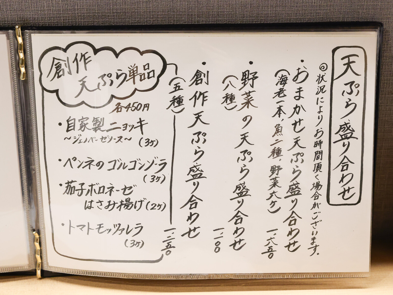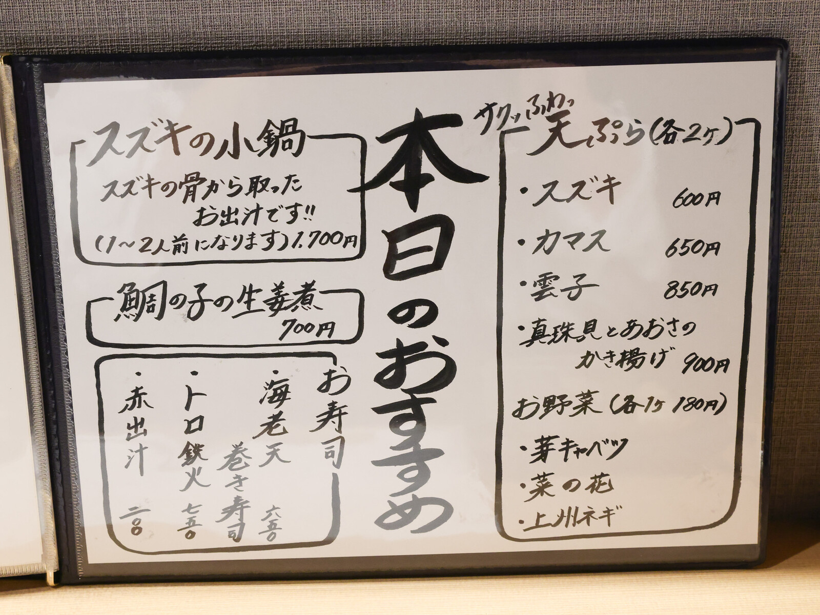 どれも美味しいですが、今回ご紹介するのは、本日のおすすめの天ぷらにある「真珠貝とあおさのかき揚げ」