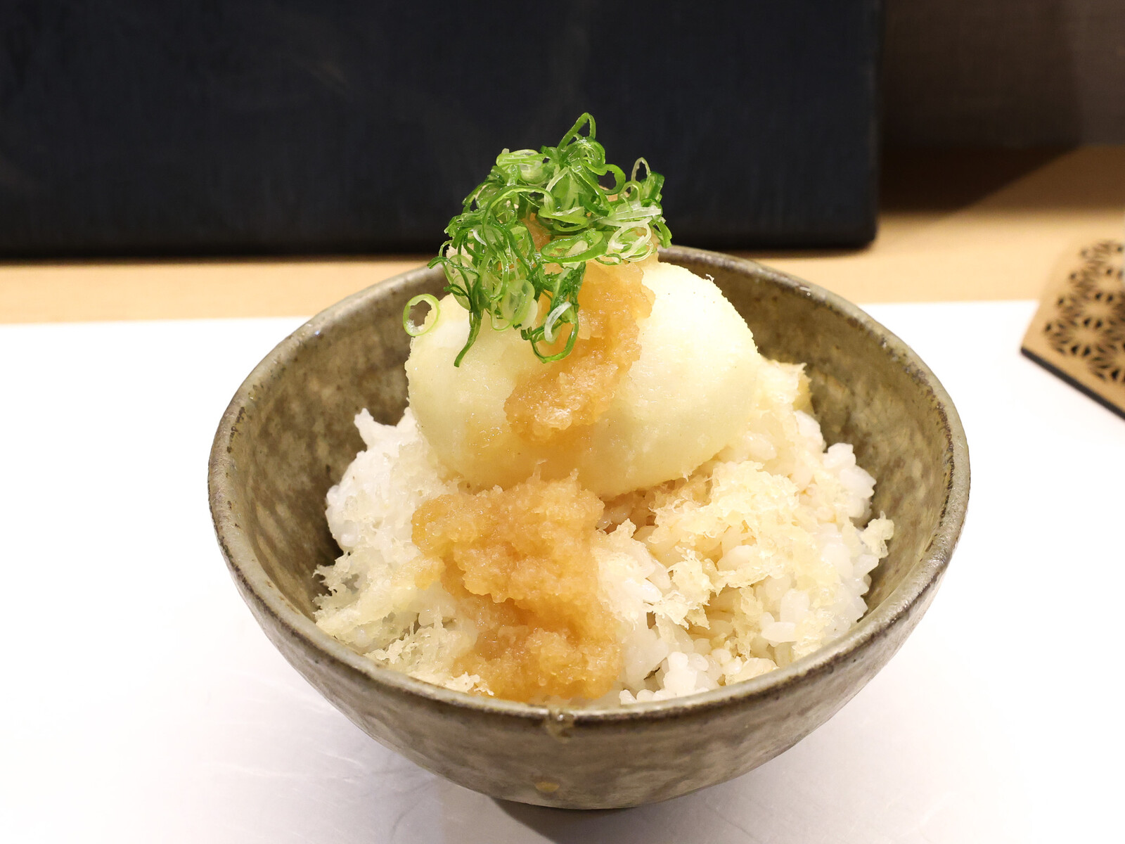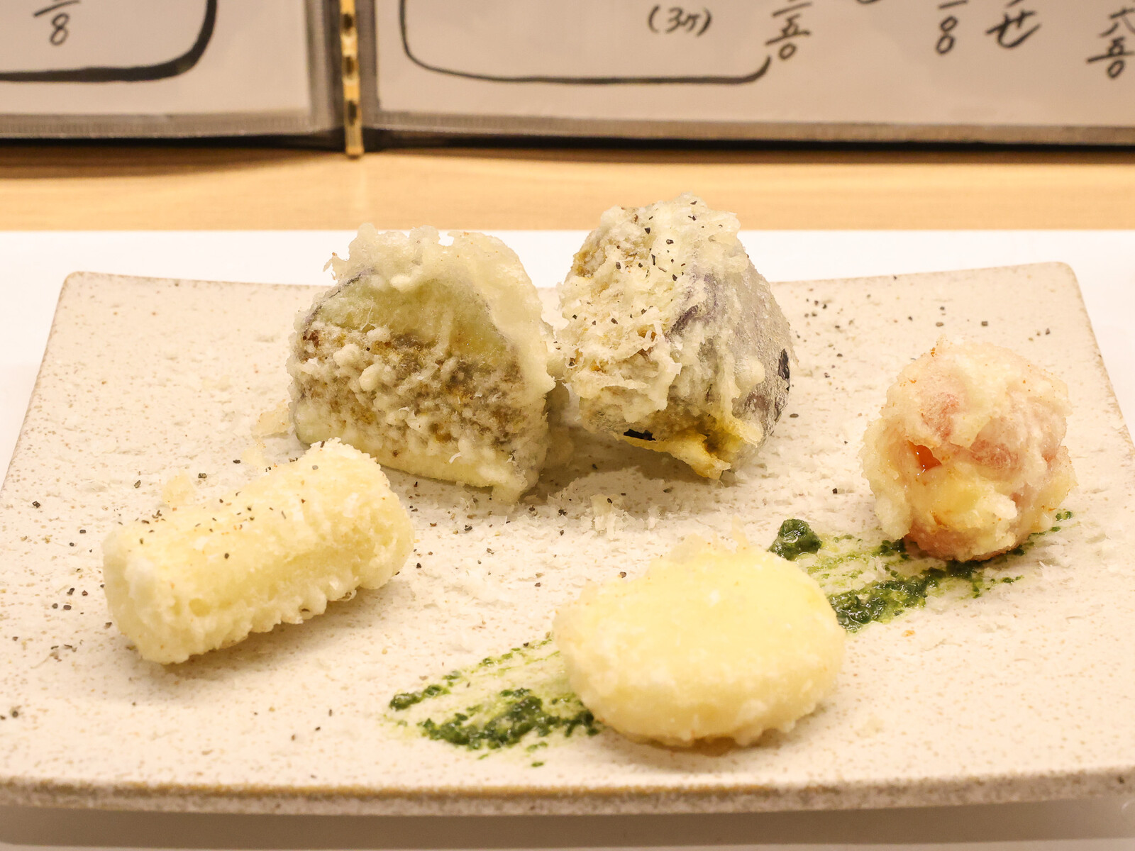 海の香りがする真珠貝とあおさのかき揚げ 天ぷらてん【交野お店一品紹介】