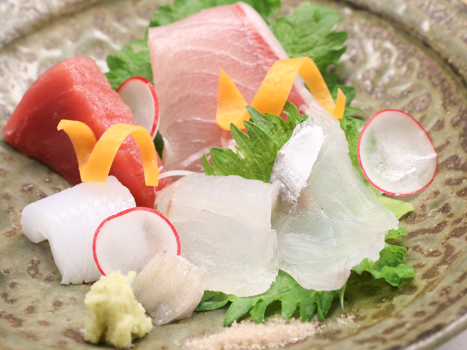 マグロ、ブリ、手前左からアオリイカ、コチ、ヒラメ。