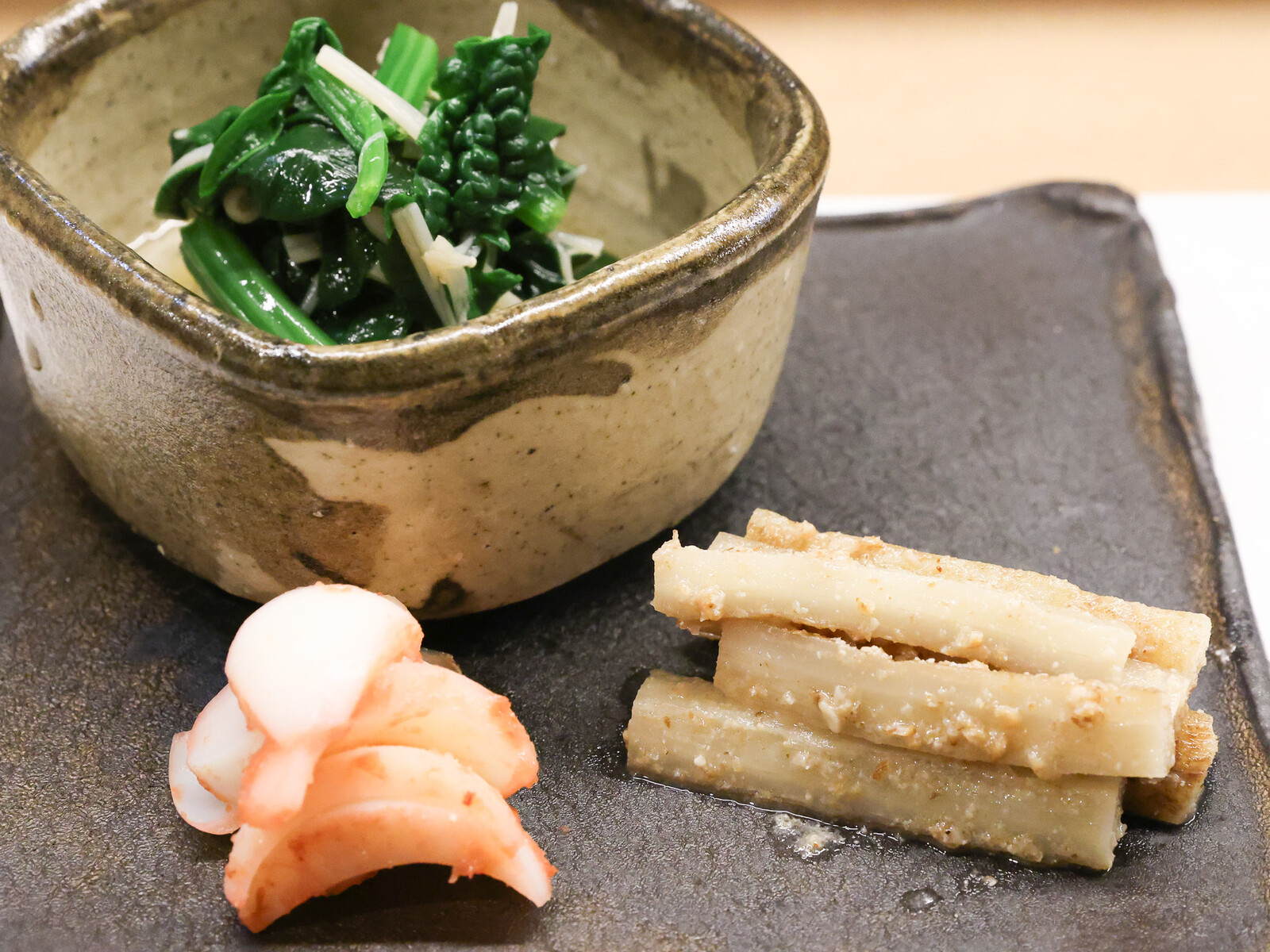 奥からちぢみほうれん草とエノキのおひたし、ゆりねの梅肉あえ、たたきごぼう