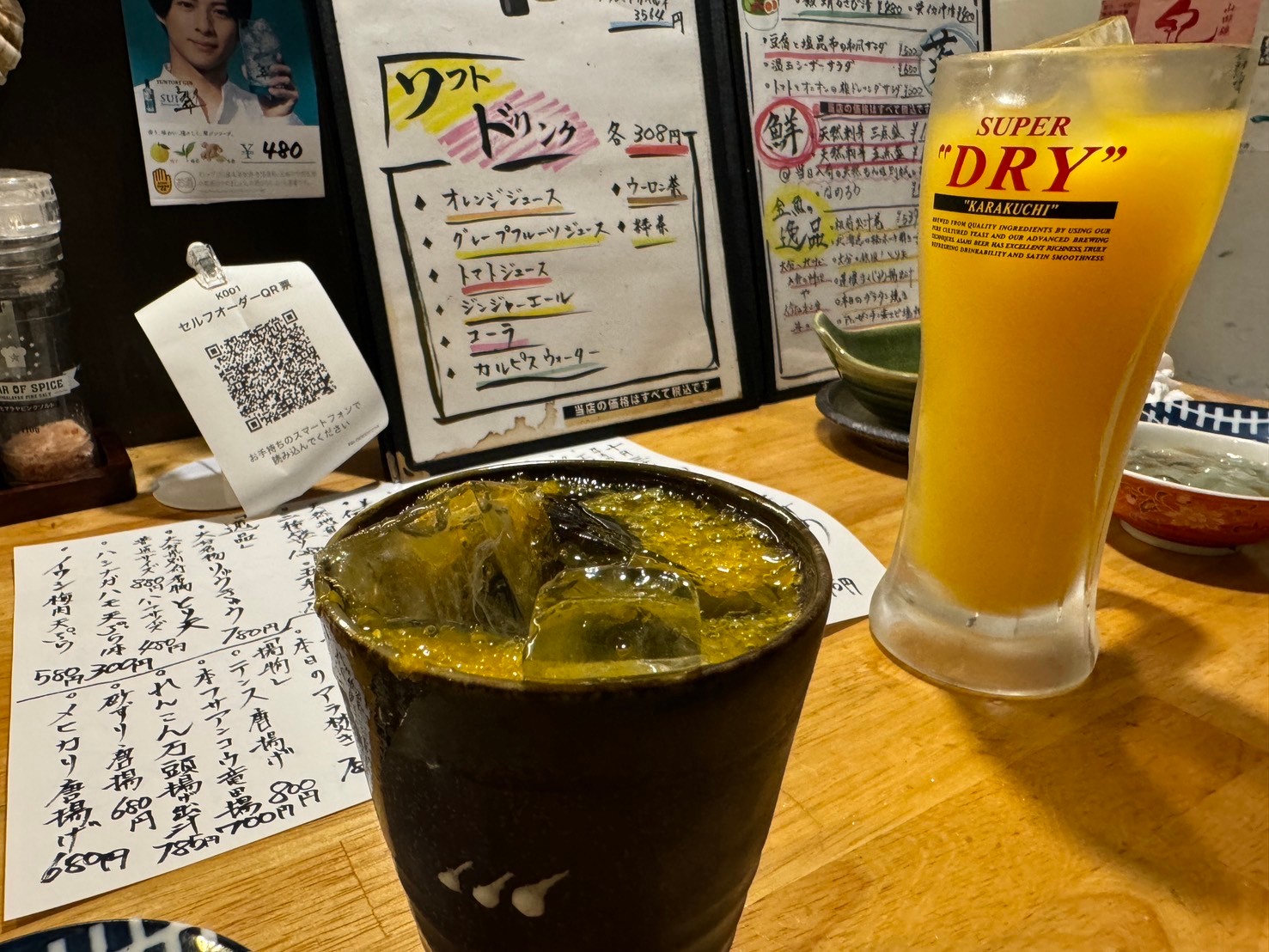 最初に注文したドリンクは「荒漉しミカン酒(ソーダ割り)」(540円)と「オレンジジュース」(308円)です。