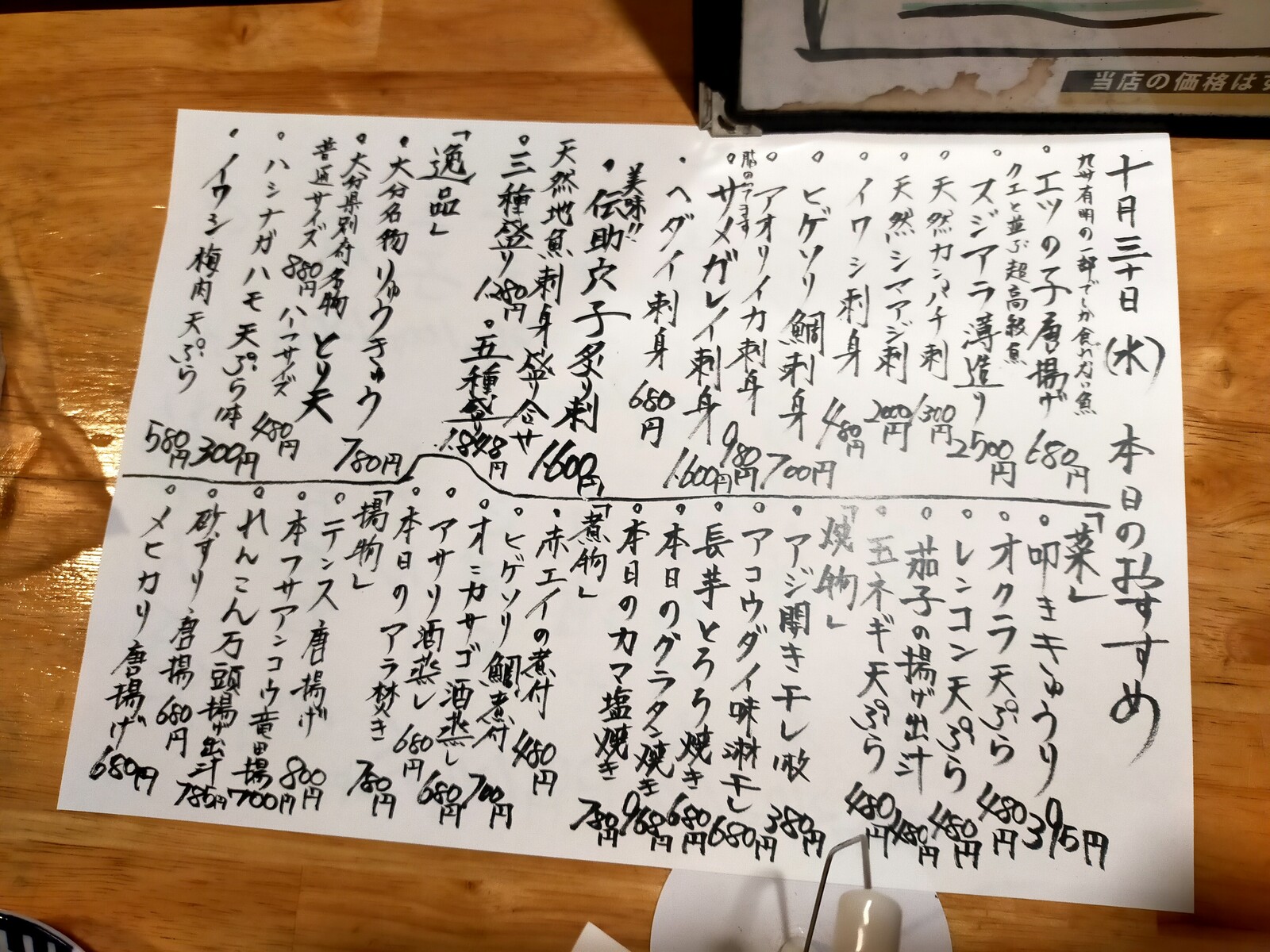 当日入荷の天然物は別紙の「本日のおすすめ」で紹介されています。
