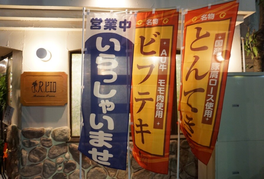 入口横には「ビフテキ」「とんてき」と書かれたノボリがヒラリ。