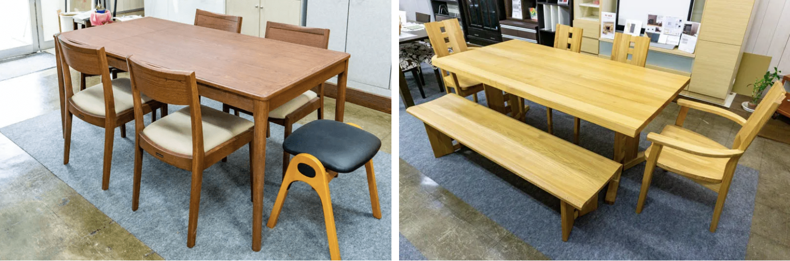 家具の田辺さんは、お手頃価格の商品から天然木・無垢一枚板まで豊富な品揃え。