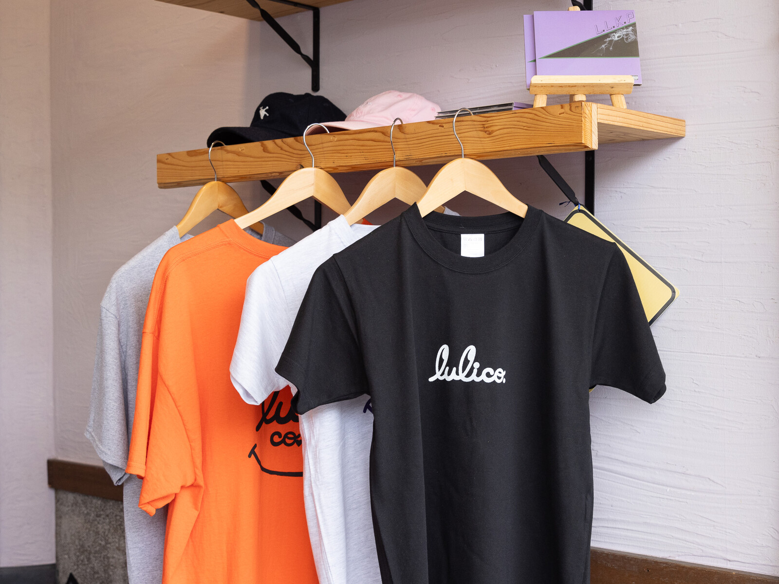 店舗の横に、グッズ販売もされていてお店のロゴの入ったお洋服や帽子など並んでいました。