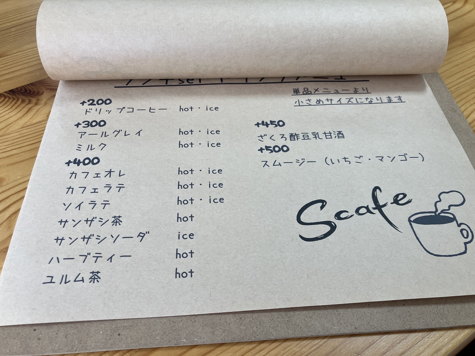 お値段プラスで、ミニサイズ(単品メニューより小さめサイズ)のドリンクをつけることができます。