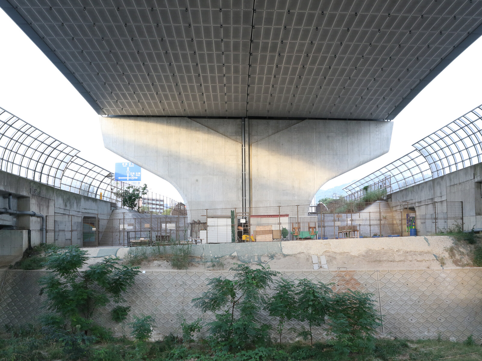 第二京阪道路の巨大な橋脚を、近くで観察できる場所です。