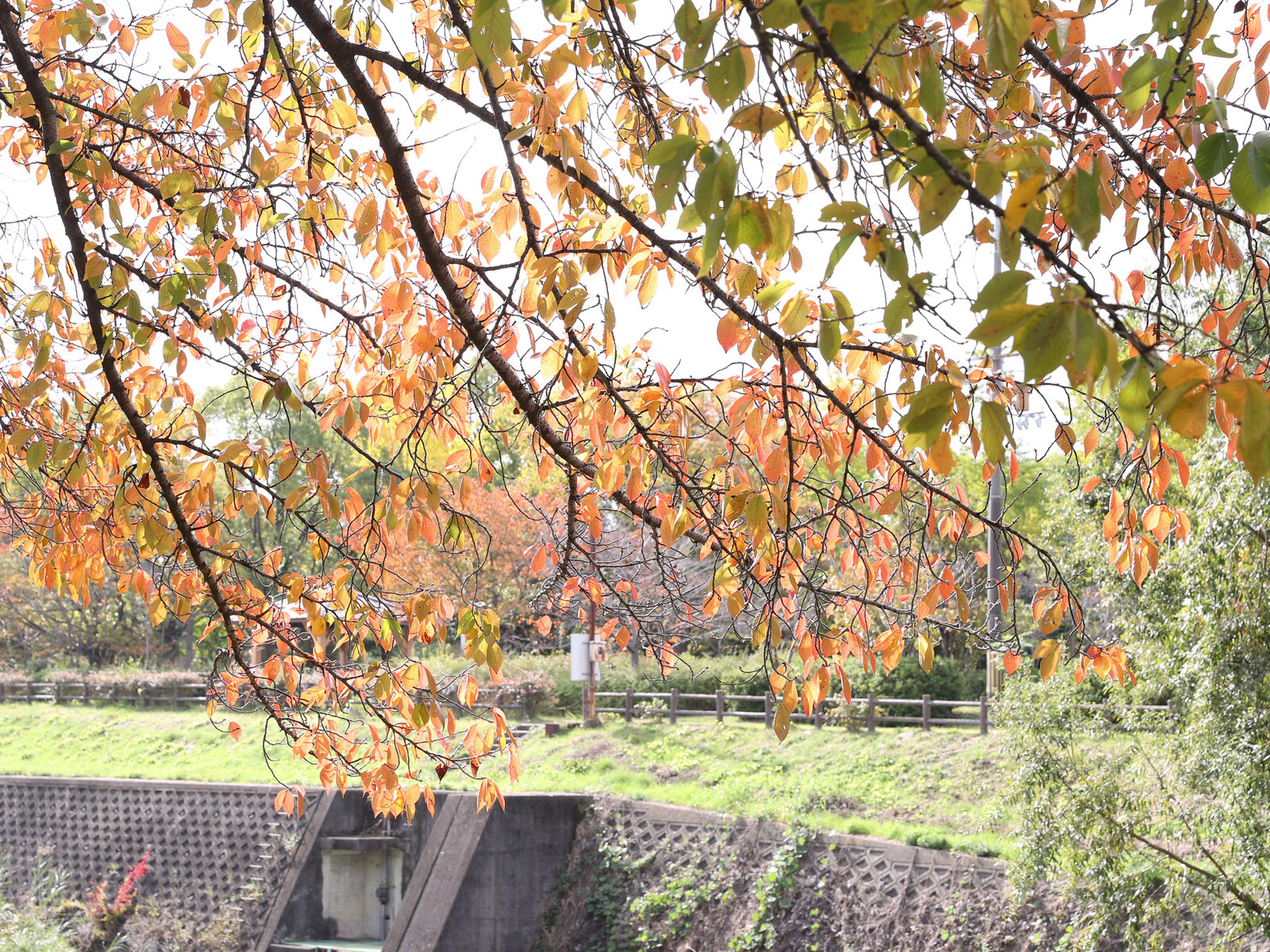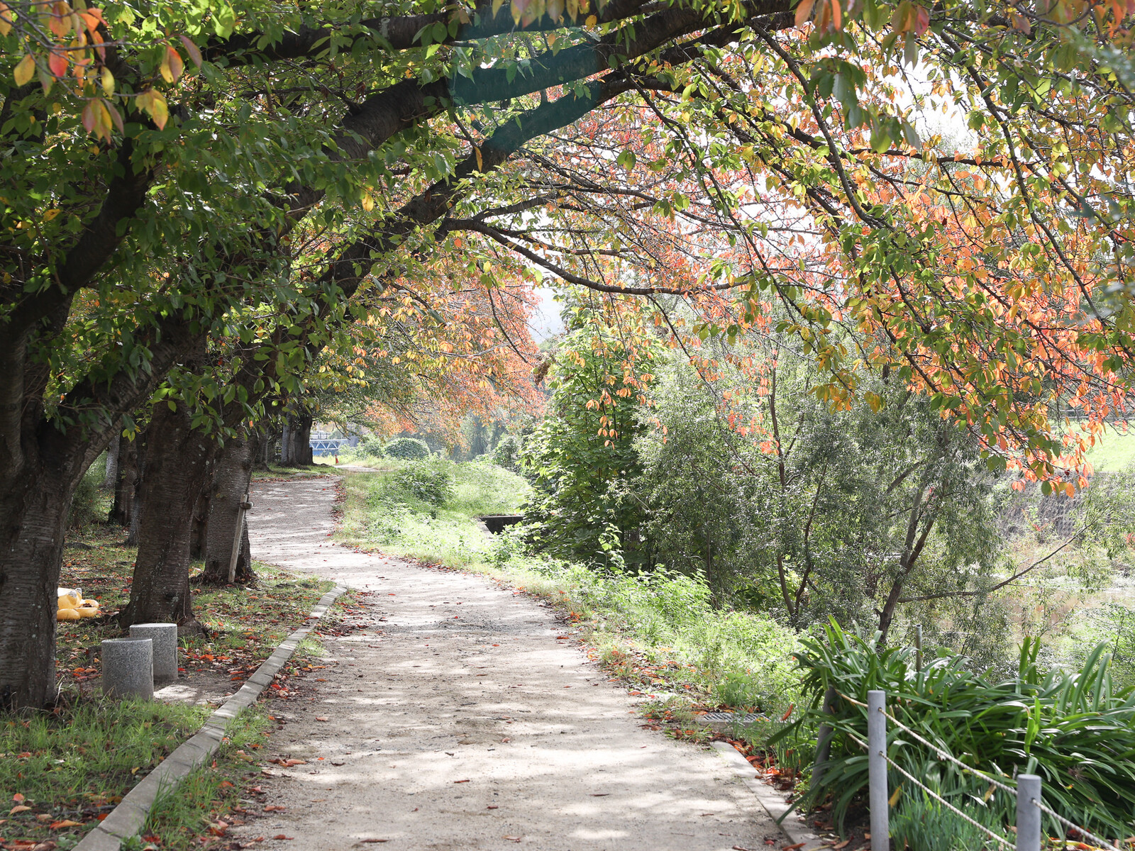 春にはピンクのトンネルになる散歩道が、カラフルな秋色に染められていました。