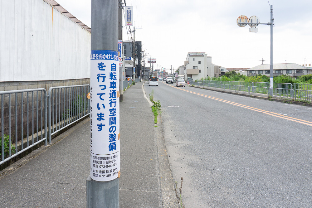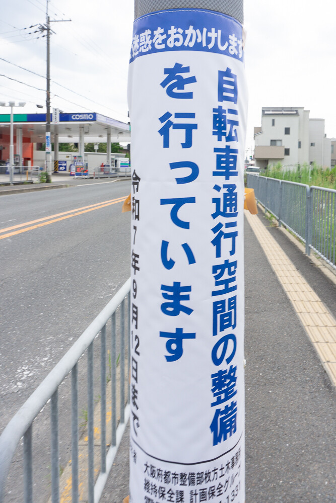 その情報によると、お知らせを掲示したのは大阪府都市整備部枚方土木事務所で、自転車通行空間を整備する工事の期間は2025年9月12日まで。