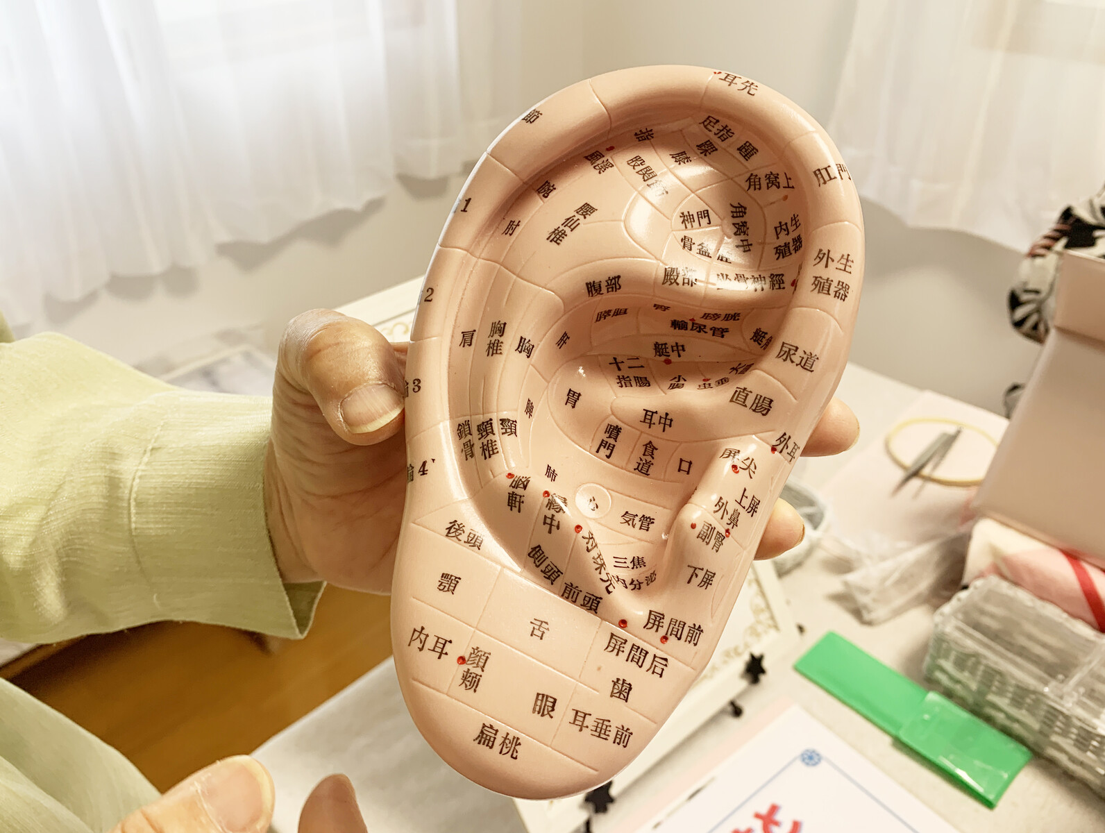 このように耳つぼマッサージをしてもらい、気になる箇所のツボに耳つぼジュエリーをつけてもらいます。