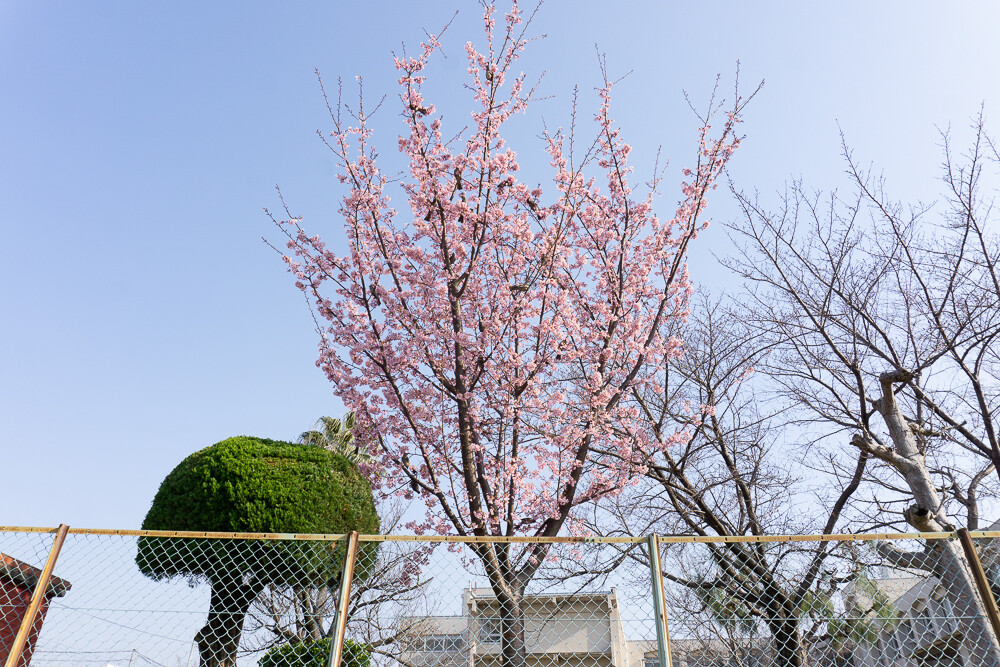 藤が尾小学校に早咲きの桜が咲いてる