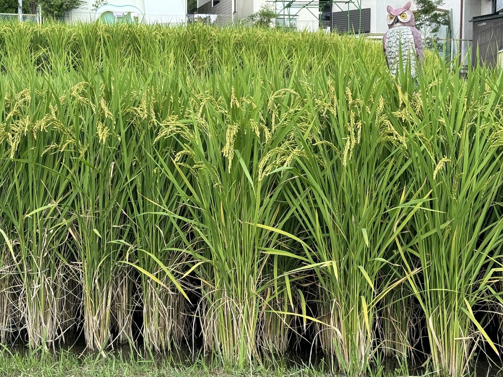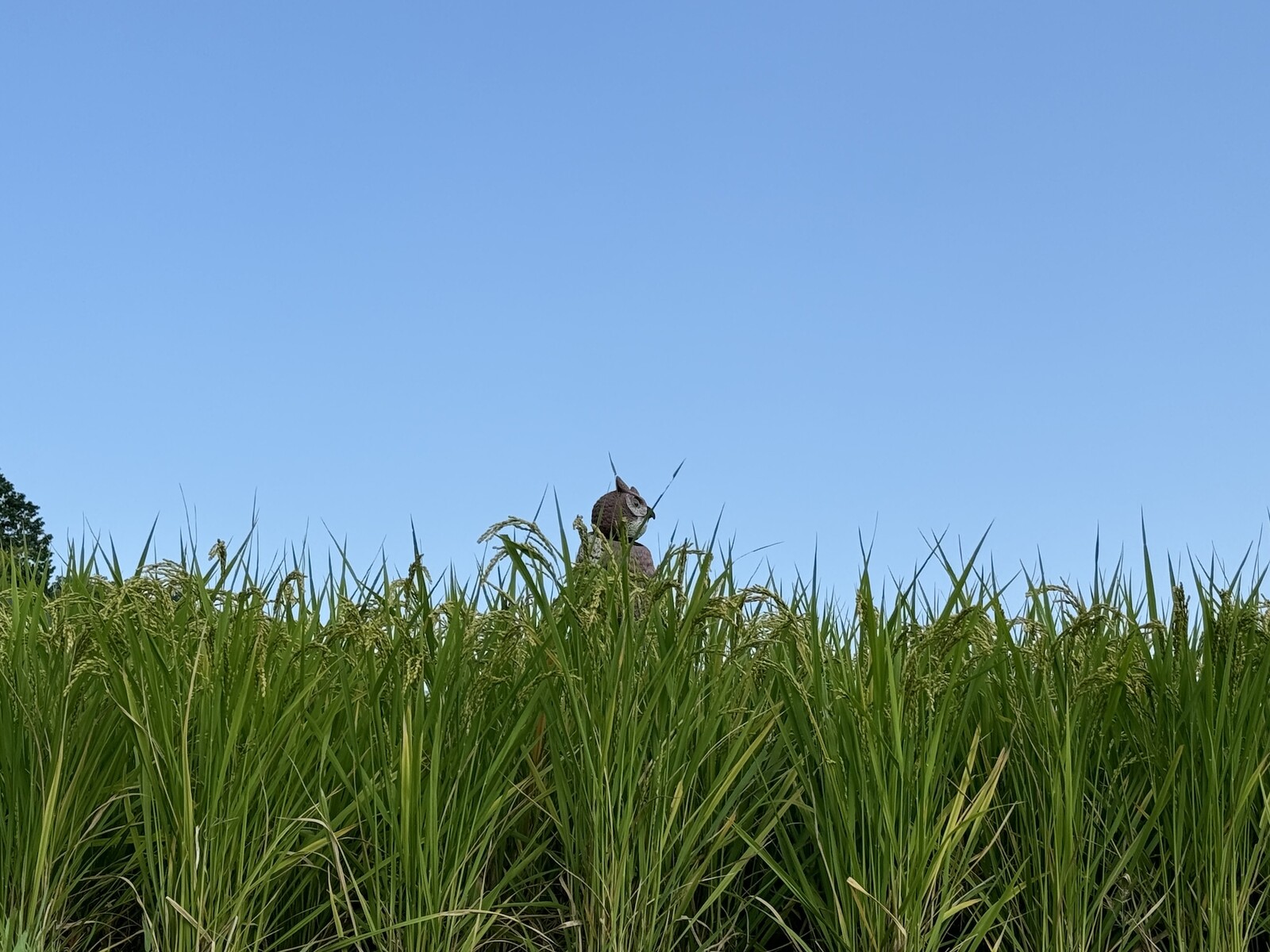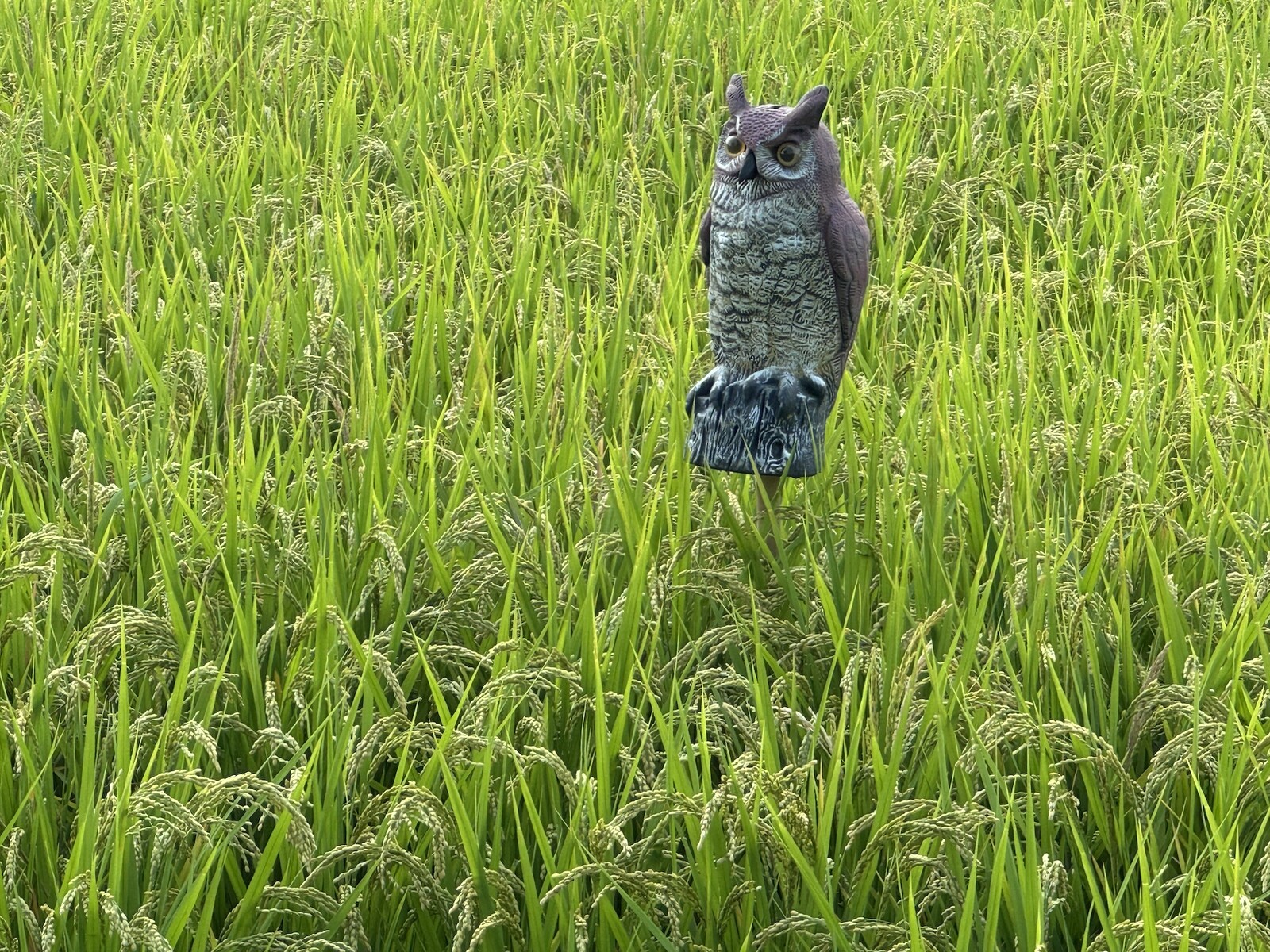 リアルなフクロウなのでぱっと見、わぁーフクロウさんおるーーー!ホウホウ鳴くのかなーーなんて思うかもしれませんが、おそらく他の鳥が田んぼにやってくるのを防ぐために設置されているのだと思います。