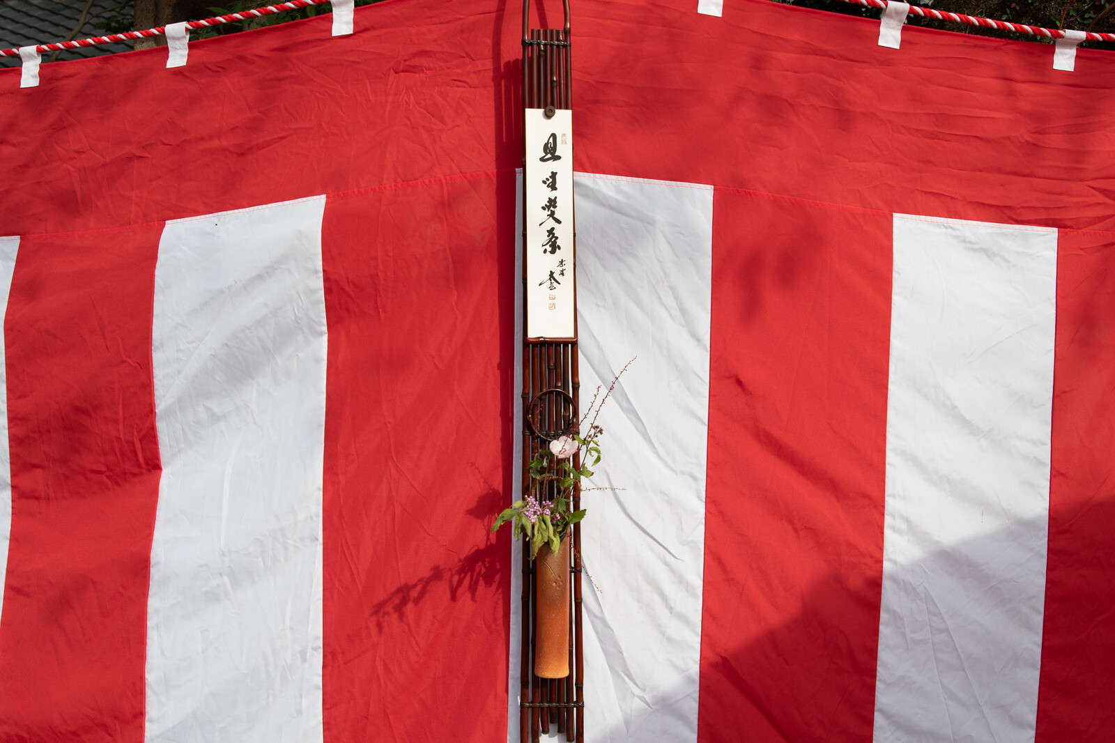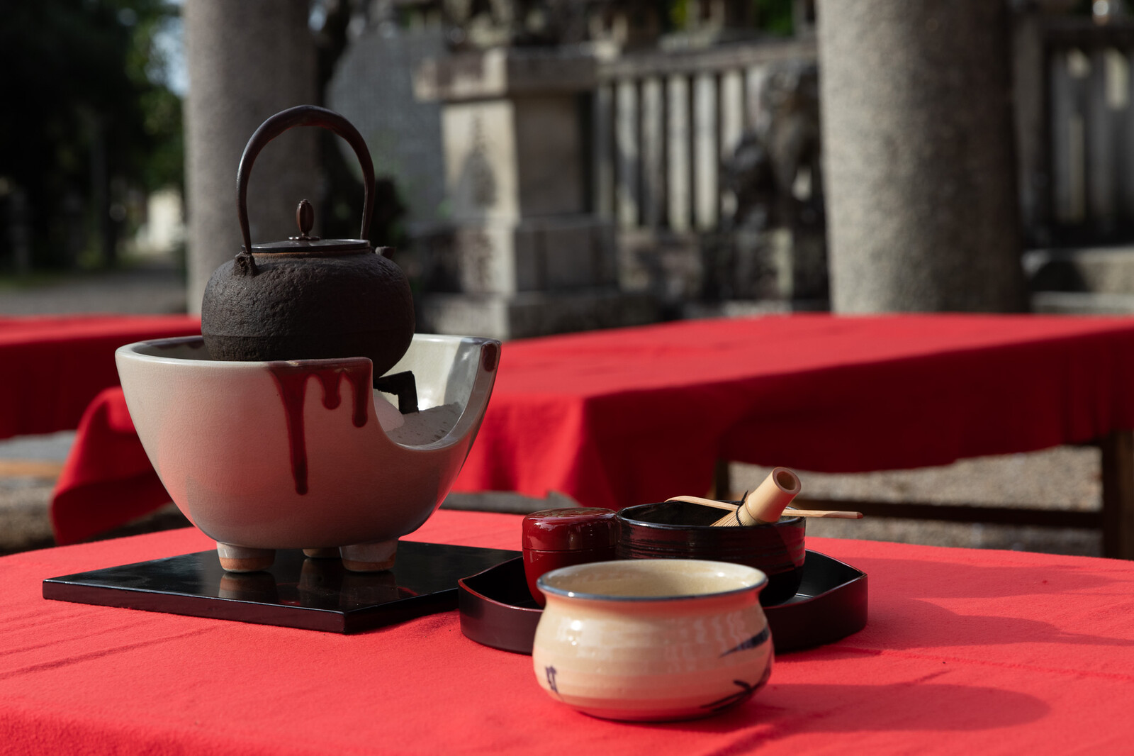 赤い野点傘と茶道具が置かれており、お茶席が設けられていました。