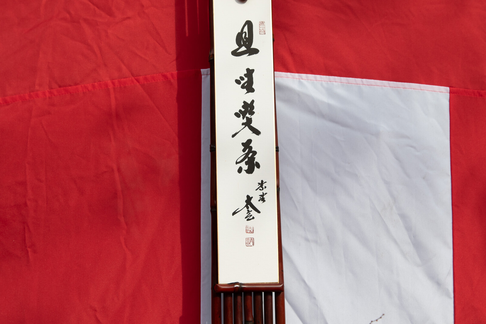 掛け軸は短冊の「且坐喫茶」(しゃざきっさ)