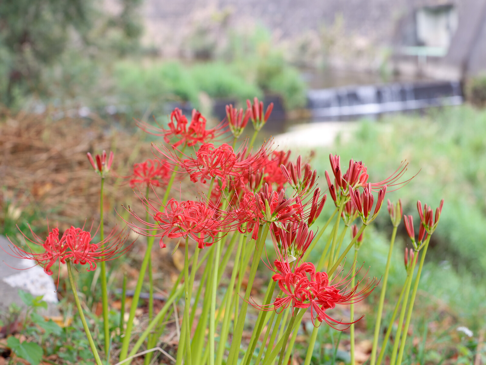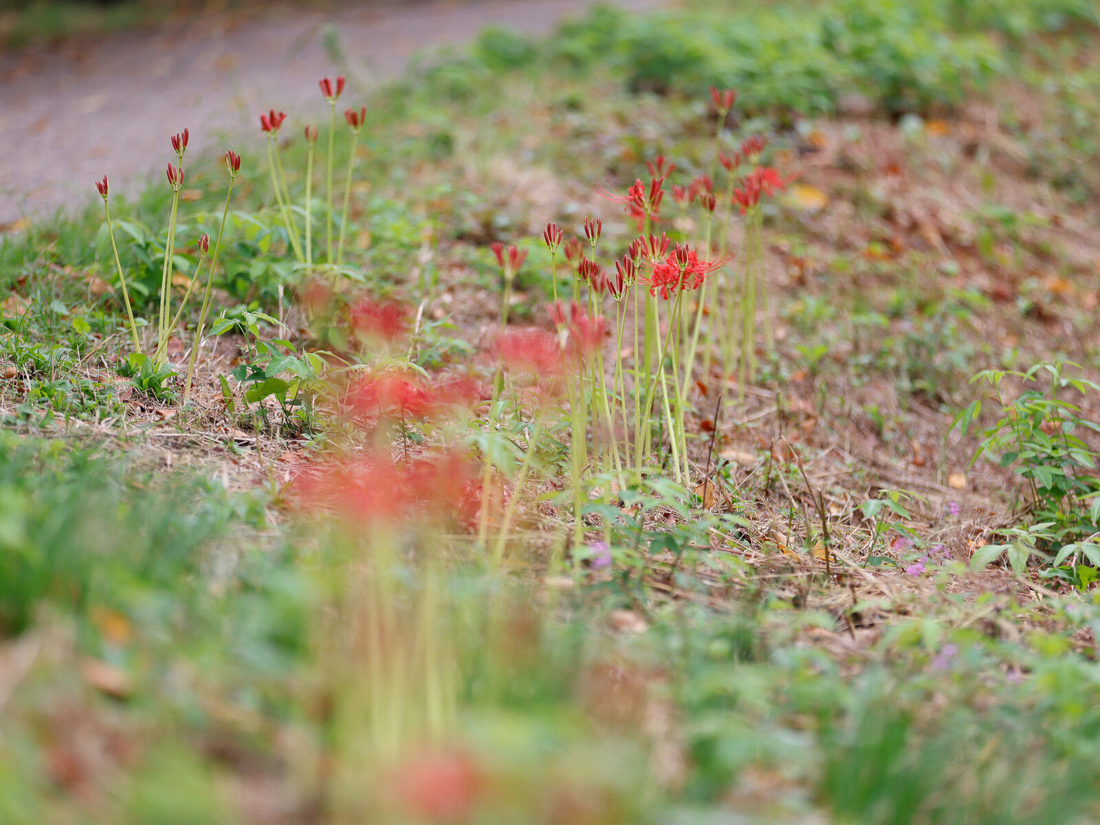その先には、しっかり咲ききっている姿と蕾の混じった姿がある彼岸花の群生を見つけました。
