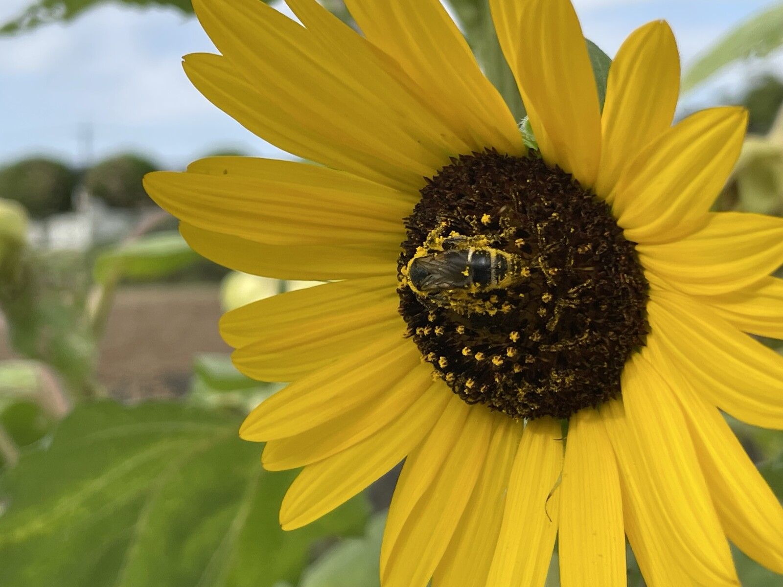 身体中にヒマワリの花粉をつけてた黄色いハチが、必死に花粉を集めていました。