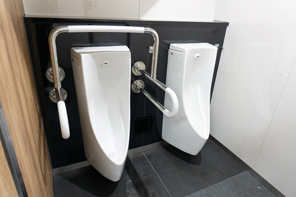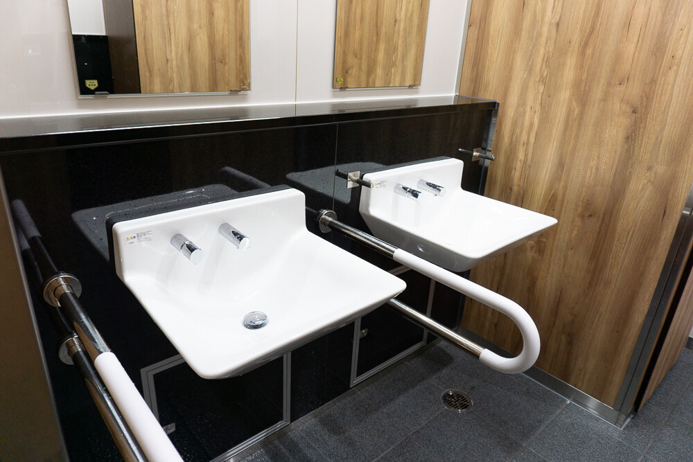 手洗い場や小便器の裏側は黒色で高級感もあります。