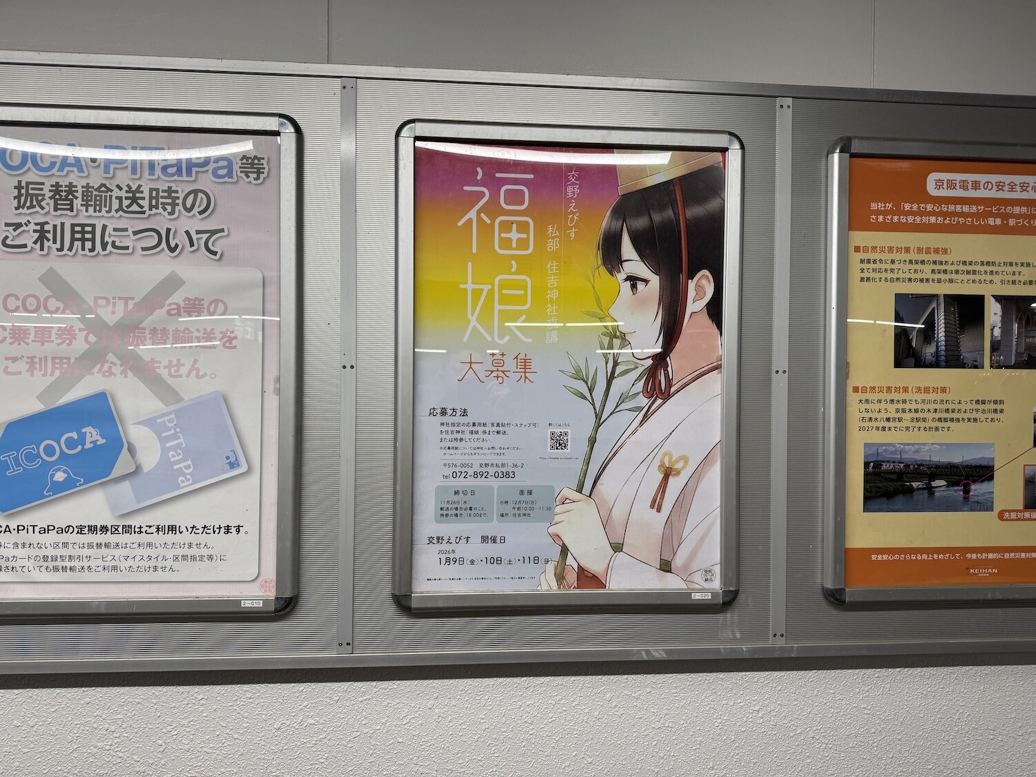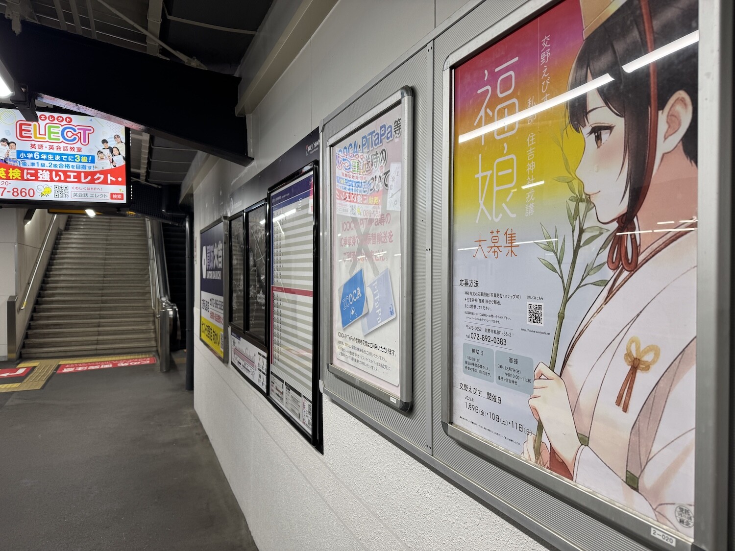ホームの壁面には京阪からのお知らせだったり、イベント告知だったり、広告だったりといろいろなものが掲示されているのですが、現在、住吉神社の福娘募集のポスターが掲示されています。