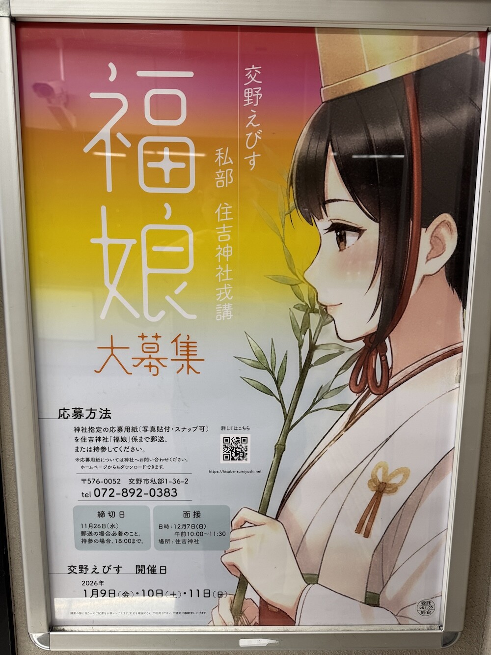 交野市駅のところに住吉神社、交野えびすの福娘募集のポスター出てる