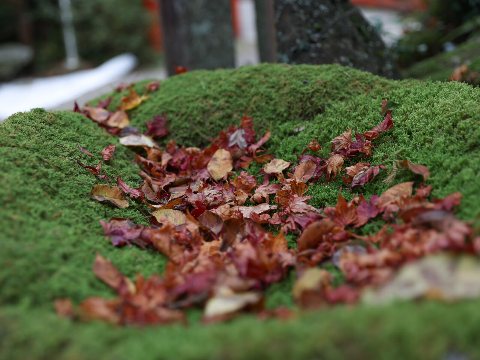 しっとりとした苔の上に積もった錦は、赤や黄色で綺麗でしたよ。